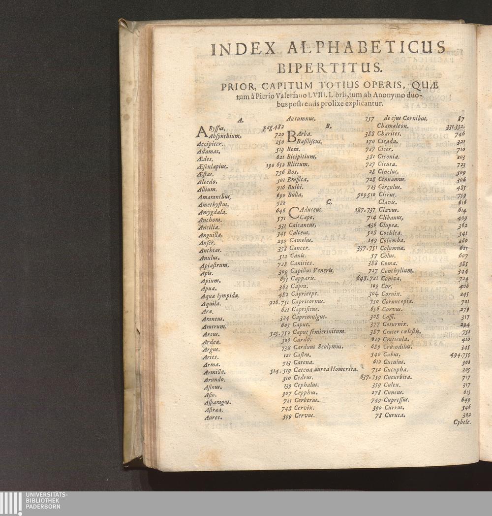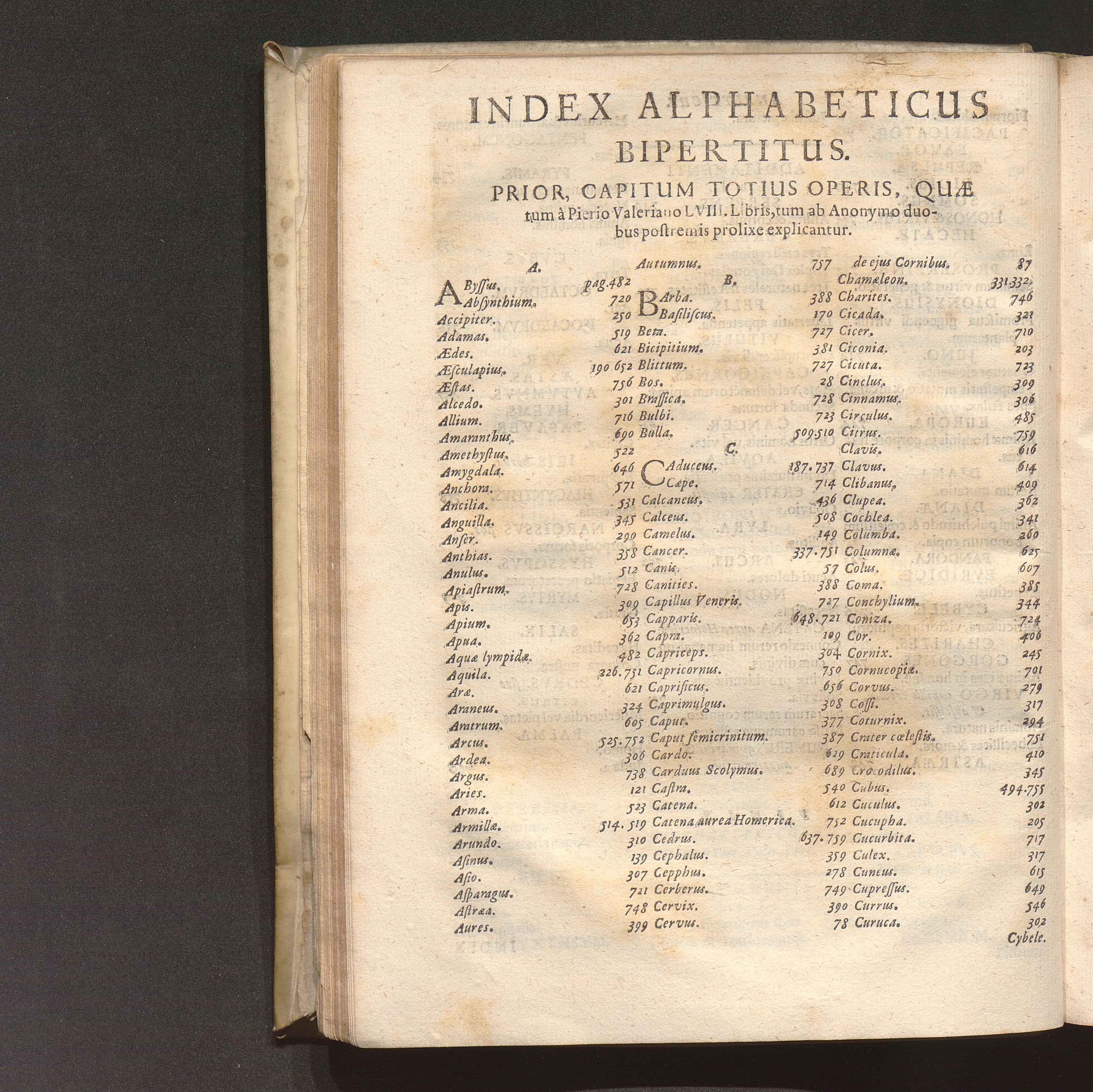 Index Alphabeticus Biper Titus. Prior, Capitum Totius Operis, Quæ tum à Pierio Valeriani[...]