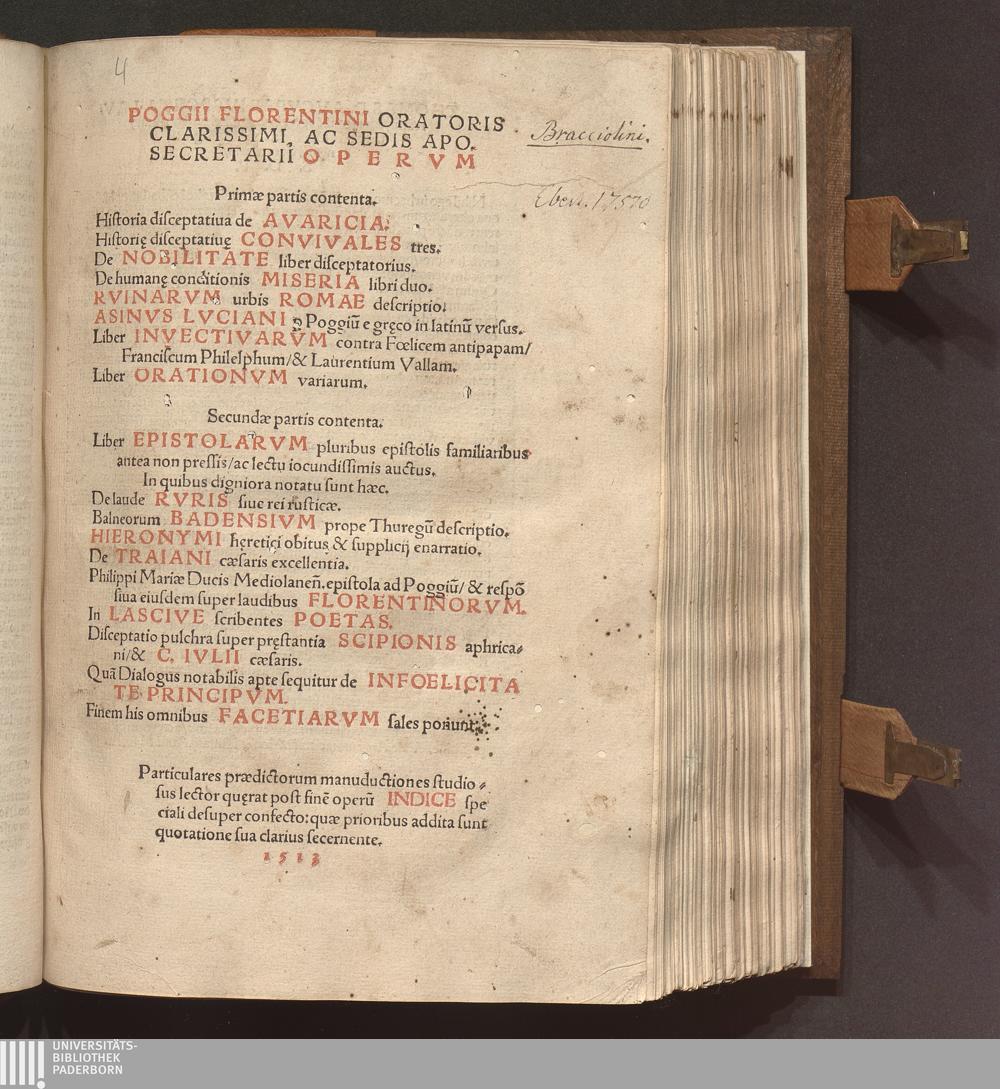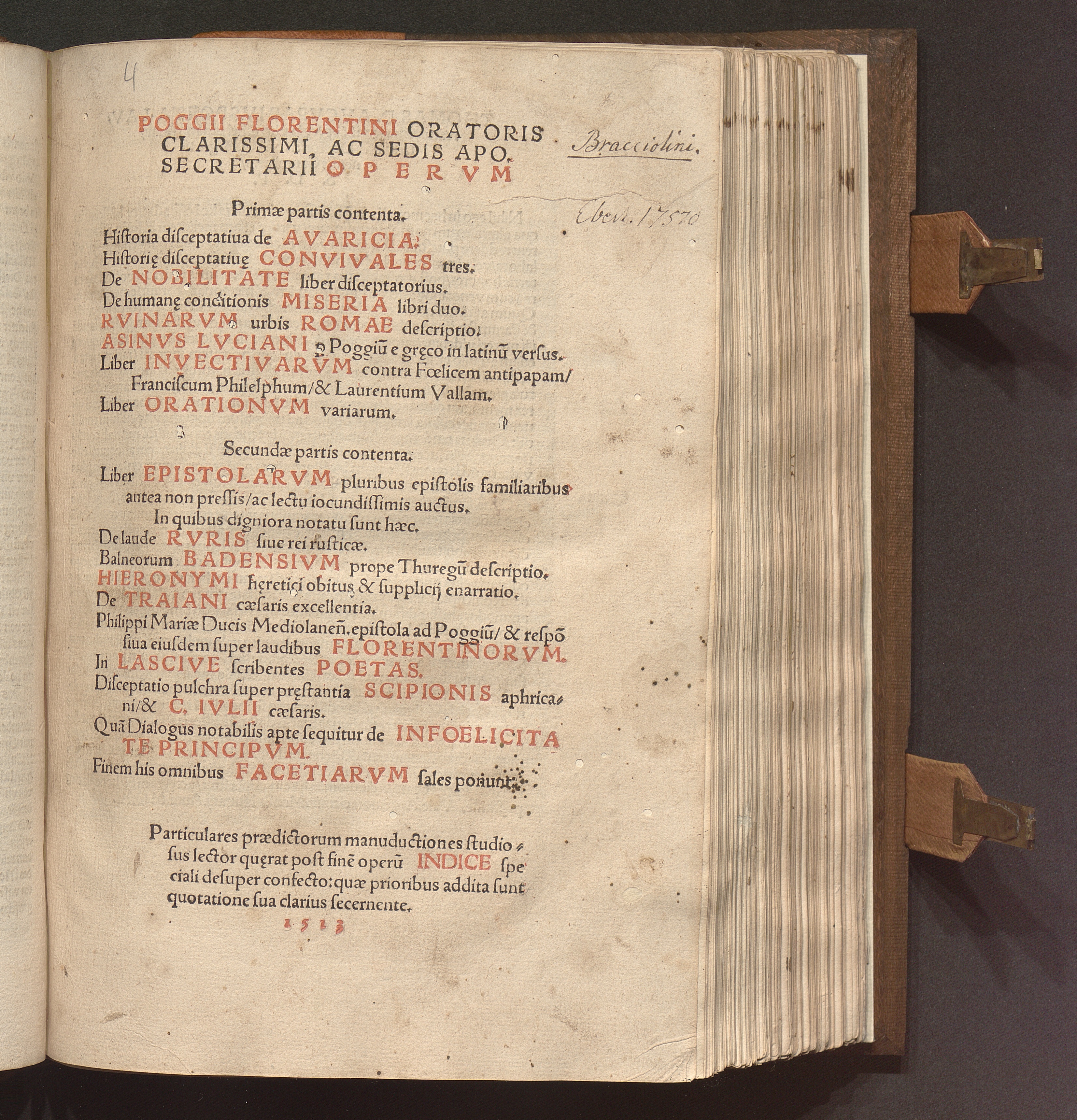 Poggii Florentini Oratoris || Clarissimi, Ac Sedis Apo.|| Secretarii Opervm || : Primae partis contenta. Historia disceptatiua de Avaricia. Histori[a]e disceptatiu[a]e Convivales tres. ... Asinvs Lvciani p[er] Poggiu[m] e gr[a]eco in latinu[m] versus. ... Secundae partis contenta. Liber Epistolarvm ... De laude Rvris siue rei rusticae. ... Finem ... Facetiarvm sales ponunt. ... Indice ... desuper confecto ... / [hrsg. von Thomas D. Avcvparivs]