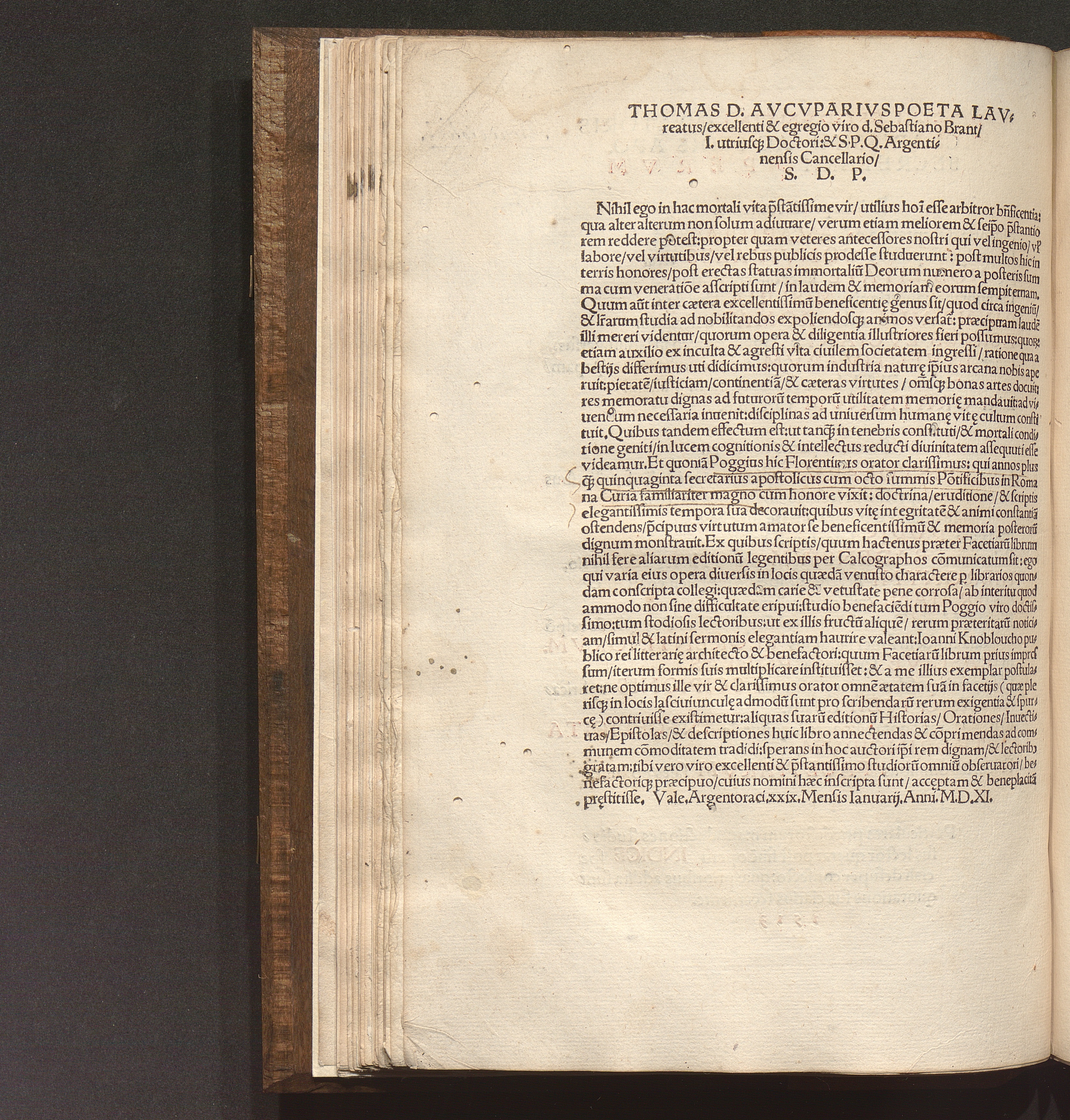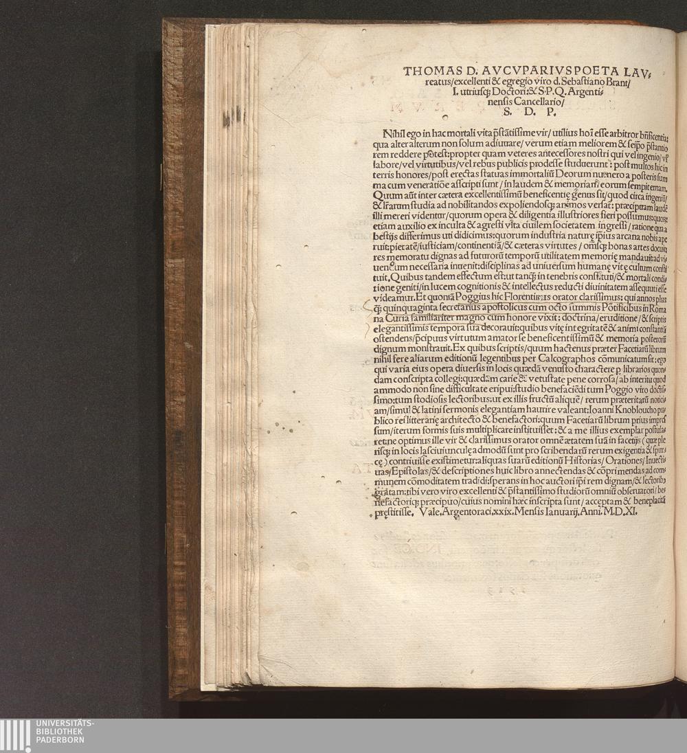 Poggii Florentini Oratoris || Clarissimi, Ac Sedis Apo.|| Secretarii Opervm || : Primae partis contenta. Historia disceptatiua de Avaricia. Histori[a]e disceptatiu[a]e Convivales tres. ... Asinvs Lvciani p[er] Poggiu[m] e gr[a]eco in latinu[m] versus. ... Secundae partis contenta. Liber Epistolarvm ... De laude Rvris siue rei rusticae. ... Finem ... Facetiarvm sales ponunt. ... Indice ... desuper confecto ... / [hrsg. von Thomas D. Avcvparivs]