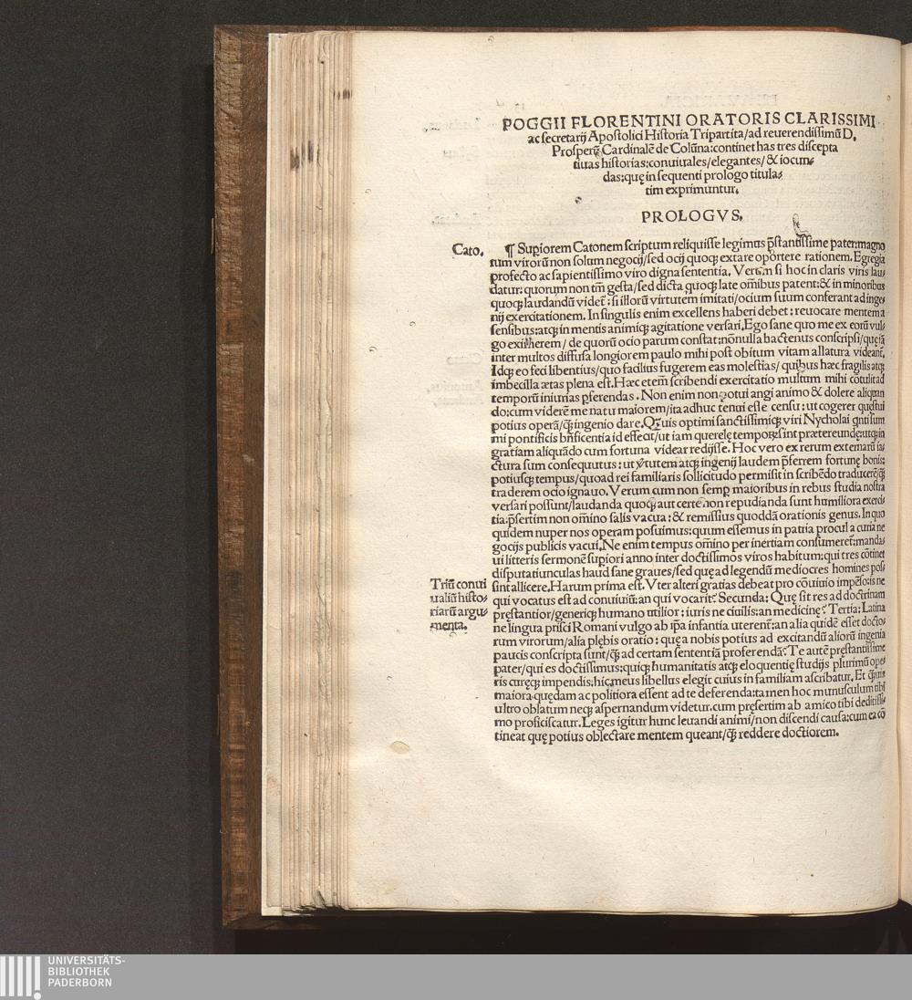 Poggii Florentini Oratoris || Clarissimi, Ac Sedis Apo.|| Secretarii Opervm || : Primae partis contenta. Historia disceptatiua de Avaricia. Histori[a]e disceptatiu[a]e Convivales tres. ... Asinvs Lvciani p[er] Poggiu[m] e gr[a]eco in latinu[m] versus. ... Secundae partis contenta. Liber Epistolarvm ... De laude Rvris siue rei rusticae. ... Finem ... Facetiarvm sales ponunt. ... Indice ... desuper confecto ... / [hrsg. von Thomas D. Avcvparivs]