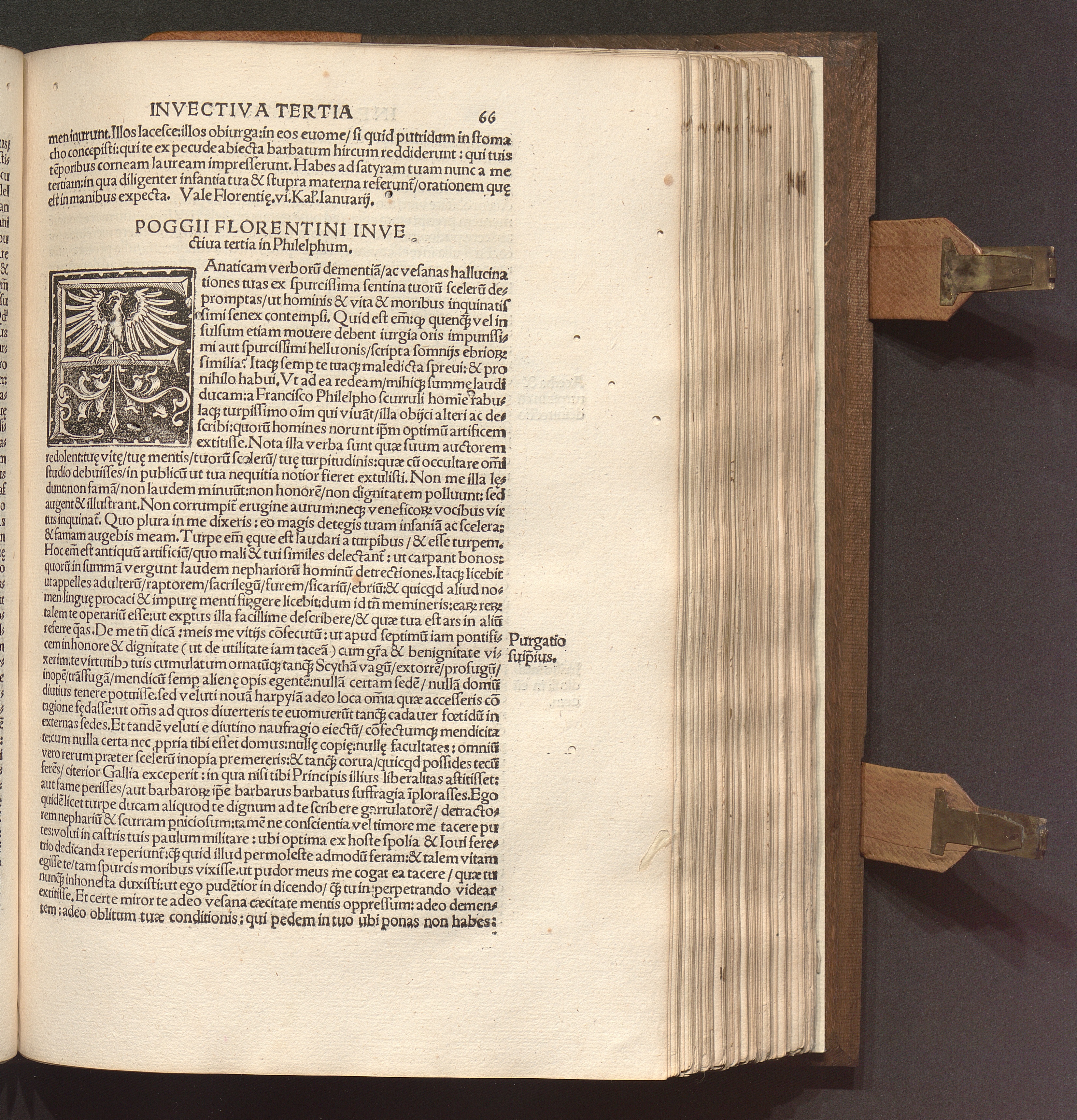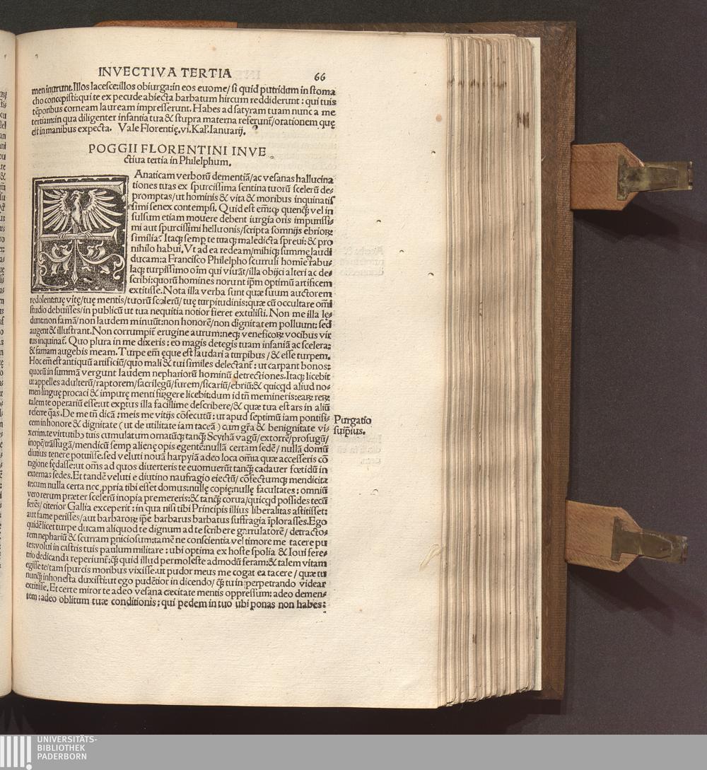 Poggii Florentini Oratoris || Clarissimi, Ac Sedis Apo.|| Secretarii Opervm || : Primae partis contenta. Historia disceptatiua de Avaricia. Histori[a]e disceptatiu[a]e Convivales tres. ... Asinvs Lvciani p[er] Poggiu[m] e gr[a]eco in latinu[m] versus. ... Secundae partis contenta. Liber Epistolarvm ... De laude Rvris siue rei rusticae. ... Finem ... Facetiarvm sales ponunt. ... Indice ... desuper confecto ... / [hrsg. von Thomas D. Avcvparivs]