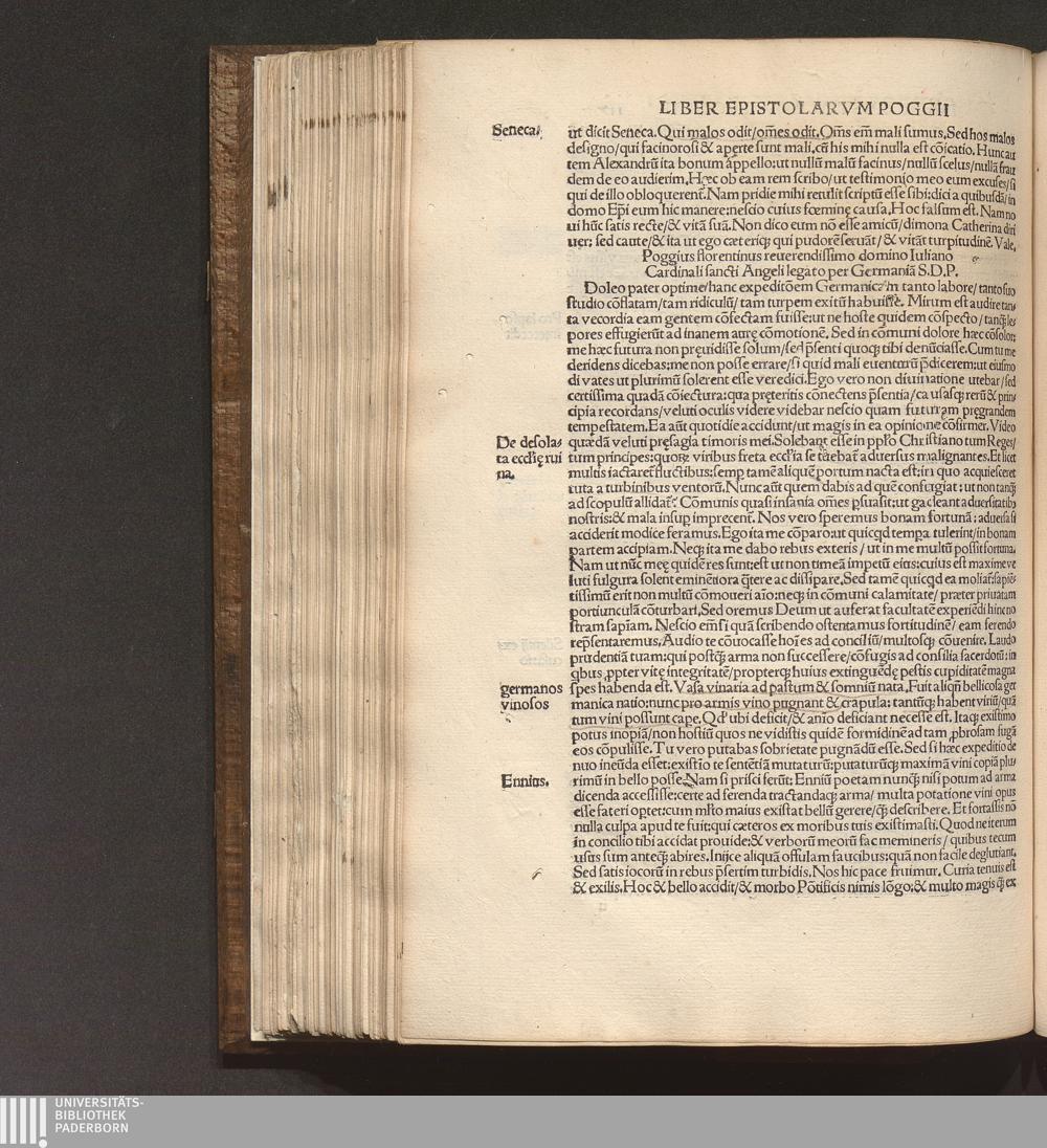 Poggii Florentini Oratoris || Clarissimi, Ac Sedis Apo.|| Secretarii Opervm || : Primae partis contenta. Historia disceptatiua de Avaricia. Histori[a]e disceptatiu[a]e Convivales tres. ... Asinvs Lvciani p[er] Poggiu[m] e gr[a]eco in latinu[m] versus. ... Secundae partis contenta. Liber Epistolarvm ... De laude Rvris siue rei rusticae. ... Finem ... Facetiarvm sales ponunt. ... Indice ... desuper confecto ... / [hrsg. von Thomas D. Avcvparivs]