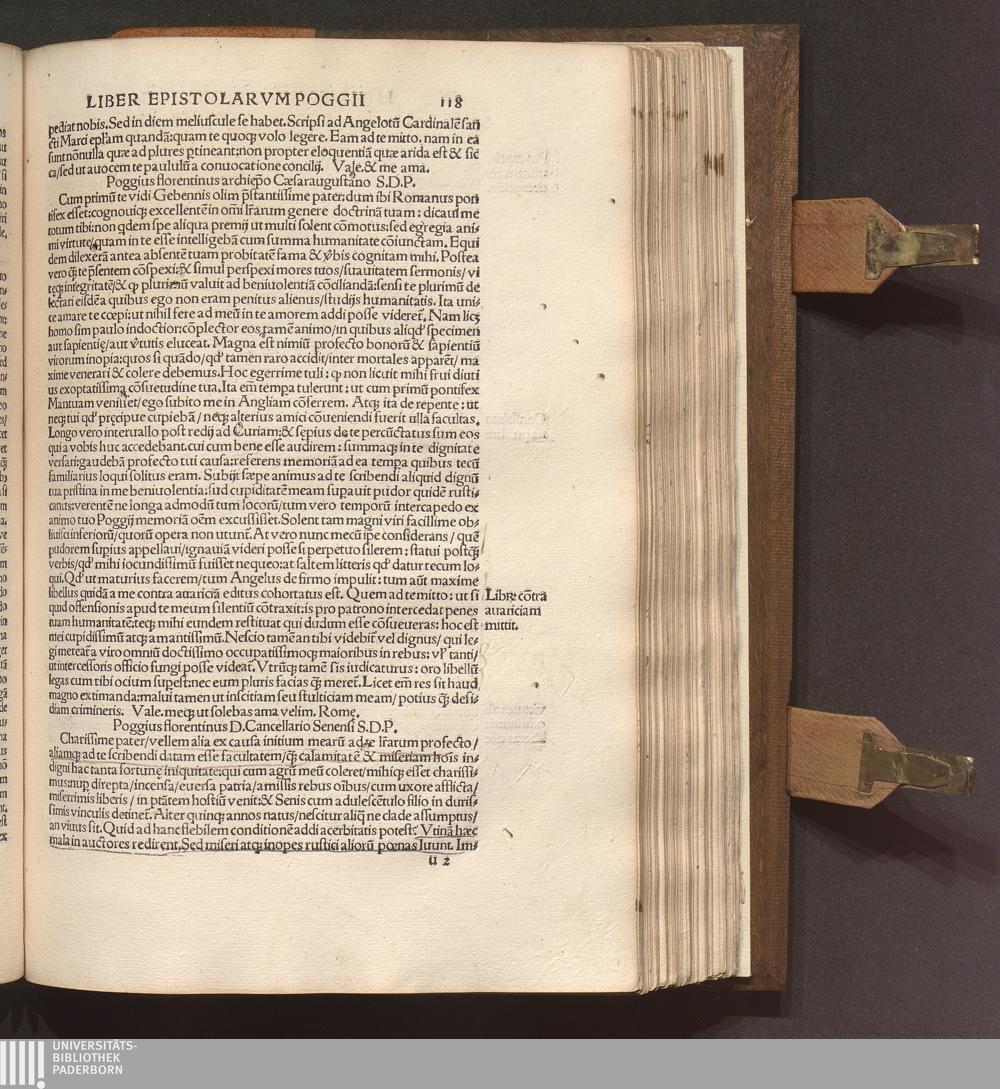 Poggii Florentini Oratoris || Clarissimi, Ac Sedis Apo.|| Secretarii Opervm || : Primae partis contenta. Historia disceptatiua de Avaricia. Histori[a]e disceptatiu[a]e Convivales tres. ... Asinvs Lvciani p[er] Poggiu[m] e gr[a]eco in latinu[m] versus. ... Secundae partis contenta. Liber Epistolarvm ... De laude Rvris siue rei rusticae. ... Finem ... Facetiarvm sales ponunt. ... Indice ... desuper confecto ... / [hrsg. von Thomas D. Avcvparivs]