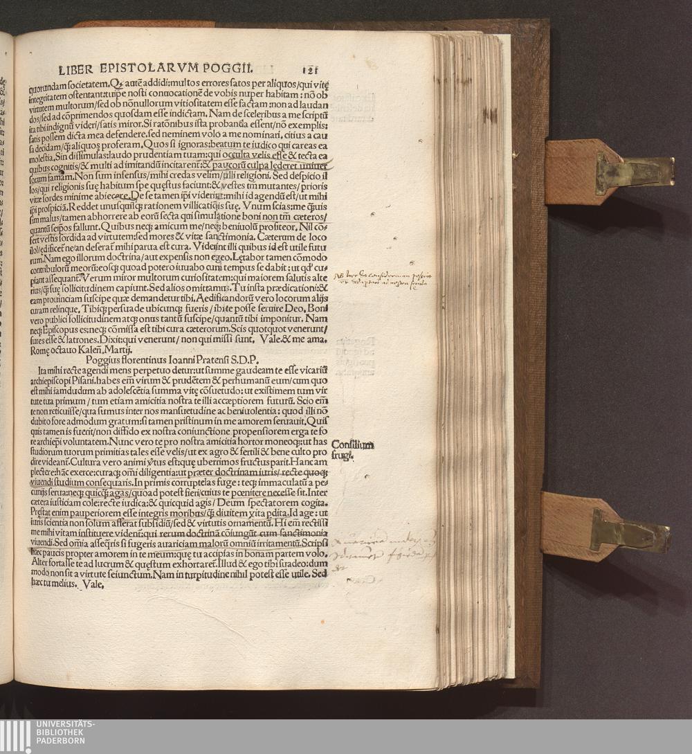 Poggii Florentini Oratoris || Clarissimi, Ac Sedis Apo.|| Secretarii Opervm || : Primae partis contenta. Historia disceptatiua de Avaricia. Histori[a]e disceptatiu[a]e Convivales tres. ... Asinvs Lvciani p[er] Poggiu[m] e gr[a]eco in latinu[m] versus. ... Secundae partis contenta. Liber Epistolarvm ... De laude Rvris siue rei rusticae. ... Finem ... Facetiarvm sales ponunt. ... Indice ... desuper confecto ... / [hrsg. von Thomas D. Avcvparivs]