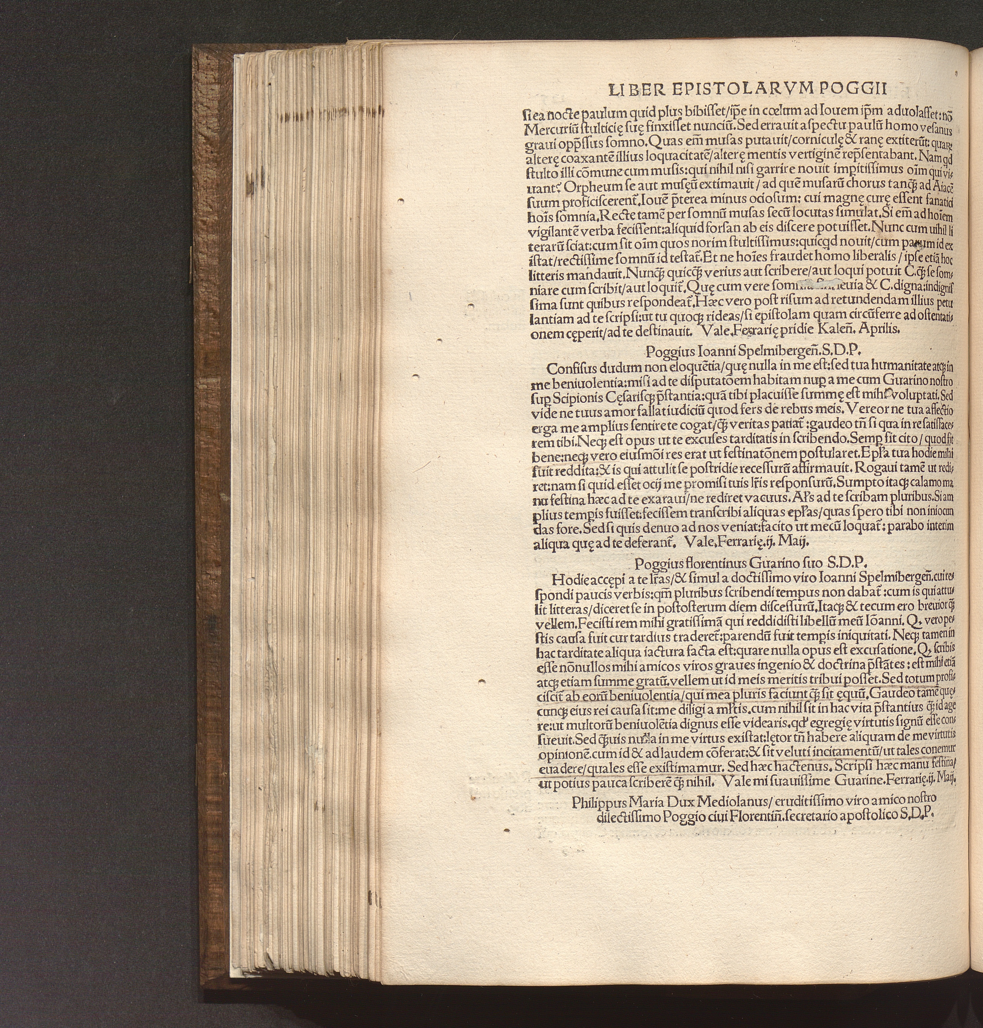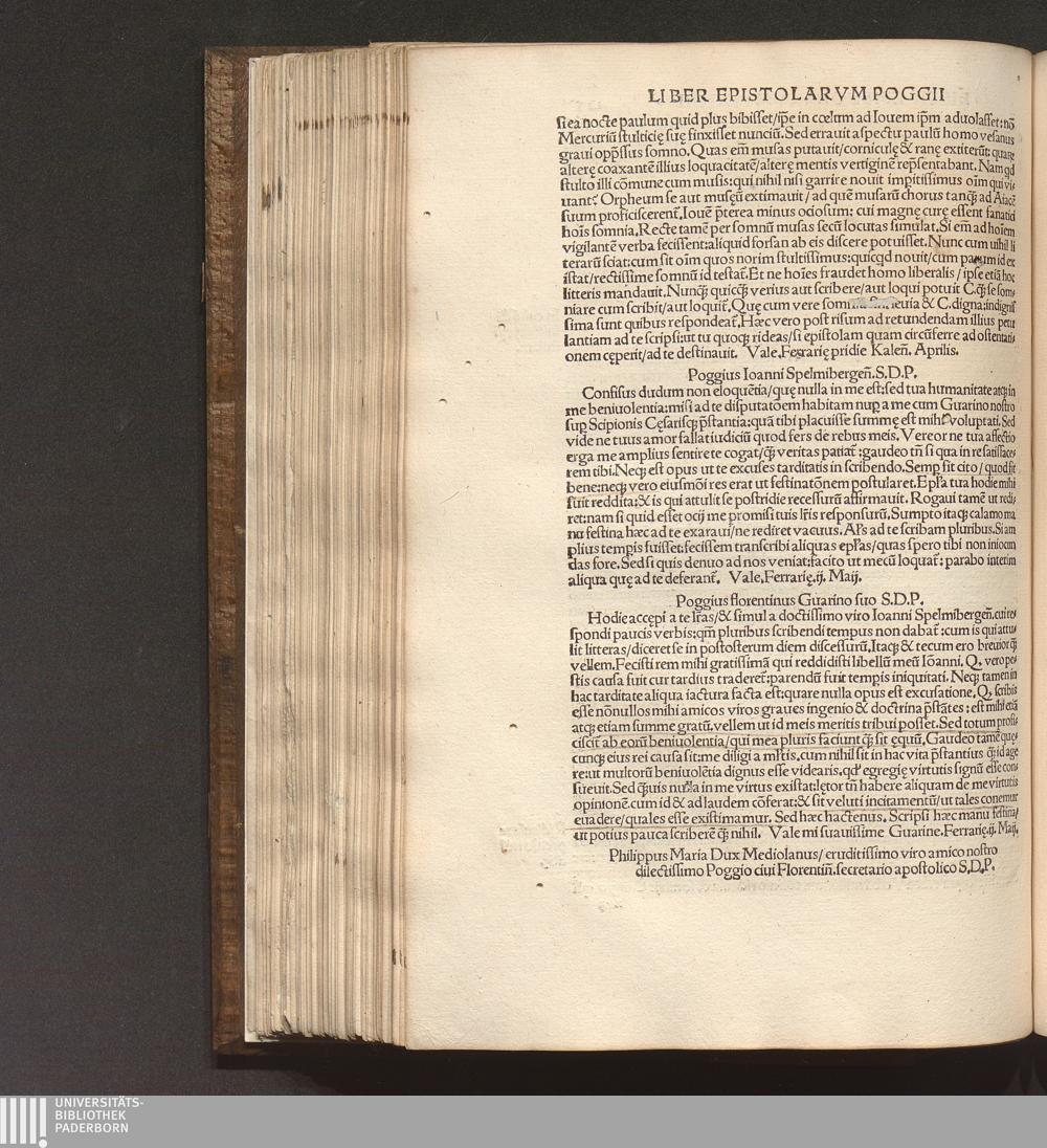 Poggii Florentini Oratoris || Clarissimi, Ac Sedis Apo.|| Secretarii Opervm || : Primae partis contenta. Historia disceptatiua de Avaricia. Histori[a]e disceptatiu[a]e Convivales tres. ... Asinvs Lvciani p[er] Poggiu[m] e gr[a]eco in latinu[m] versus. ... Secundae partis contenta. Liber Epistolarvm ... De laude Rvris siue rei rusticae. ... Finem ... Facetiarvm sales ponunt. ... Indice ... desuper confecto ... / [hrsg. von Thomas D. Avcvparivs]