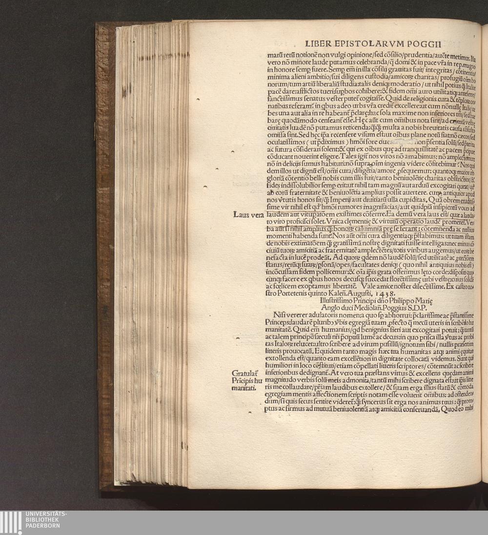 Poggii Florentini Oratoris || Clarissimi, Ac Sedis Apo.|| Secretarii Opervm || : Primae partis contenta. Historia disceptatiua de Avaricia. Histori[a]e disceptatiu[a]e Convivales tres. ... Asinvs Lvciani p[er] Poggiu[m] e gr[a]eco in latinu[m] versus. ... Secundae partis contenta. Liber Epistolarvm ... De laude Rvris siue rei rusticae. ... Finem ... Facetiarvm sales ponunt. ... Indice ... desuper confecto ... / [hrsg. von Thomas D. Avcvparivs]
