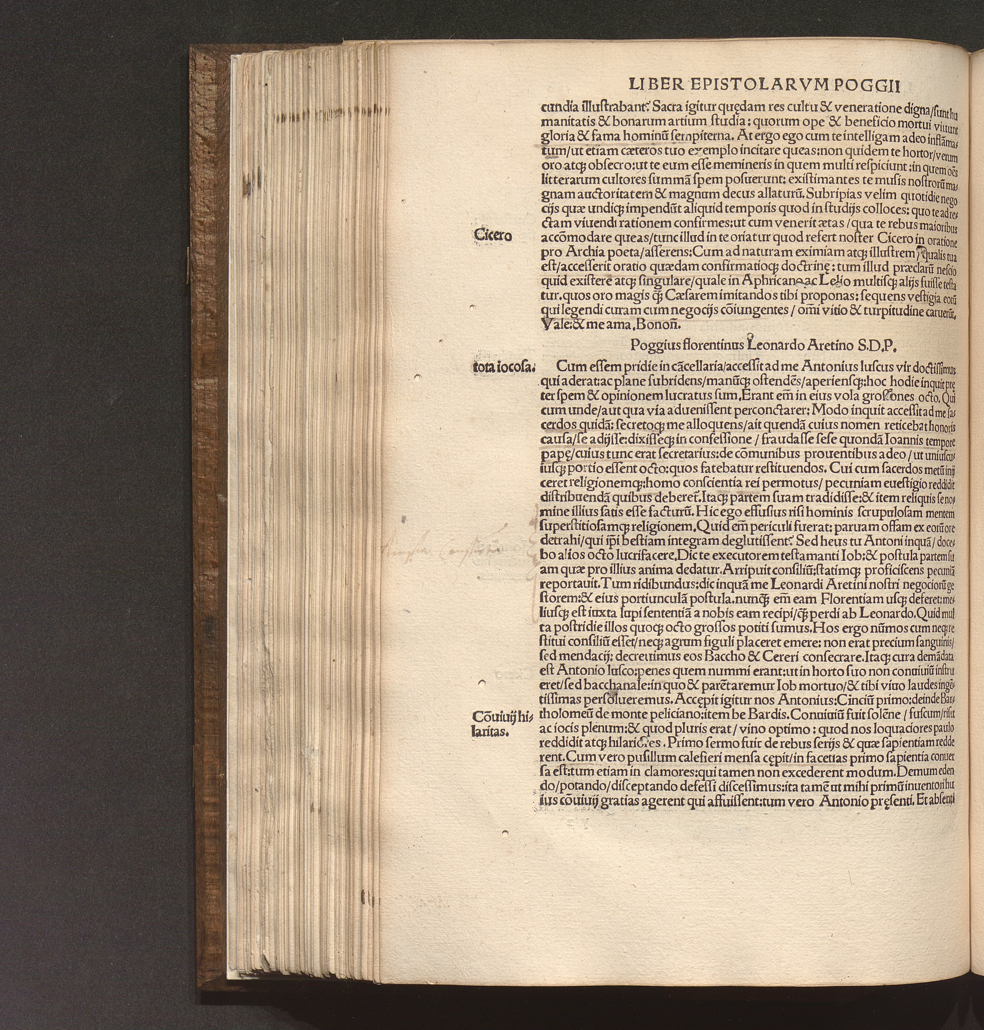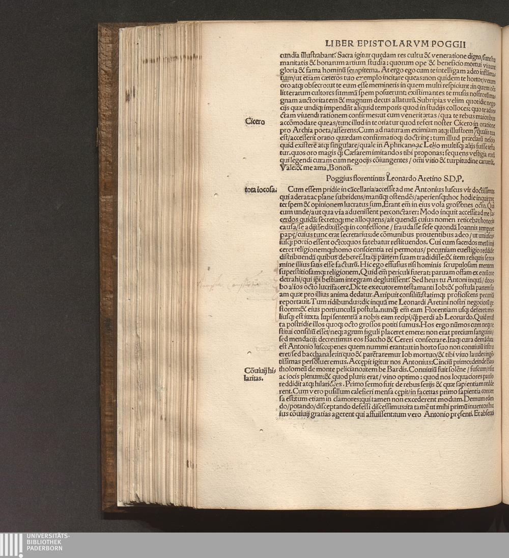 Poggii Florentini Oratoris || Clarissimi, Ac Sedis Apo.|| Secretarii Opervm || : Primae partis contenta. Historia disceptatiua de Avaricia. Histori[a]e disceptatiu[a]e Convivales tres. ... Asinvs Lvciani p[er] Poggiu[m] e gr[a]eco in latinu[m] versus. ... Secundae partis contenta. Liber Epistolarvm ... De laude Rvris siue rei rusticae. ... Finem ... Facetiarvm sales ponunt. ... Indice ... desuper confecto ... / [hrsg. von Thomas D. Avcvparivs]