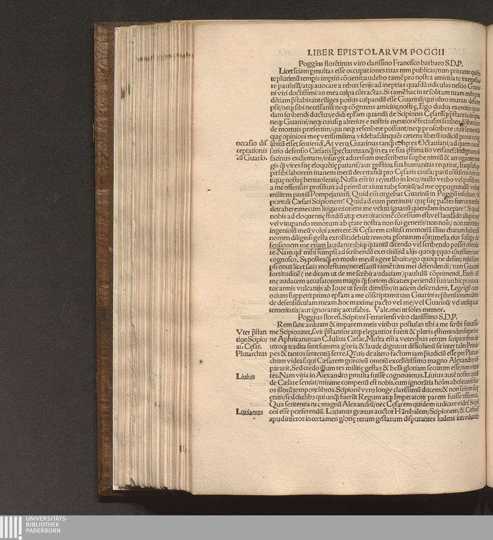 Poggii Florentini Oratoris || Clarissimi, Ac Sedis Apo.|| Secretarii Opervm || : Primae partis contenta. Historia disceptatiua de Avaricia. Histori[a]e disceptatiu[a]e Convivales tres. ... Asinvs Lvciani p[er] Poggiu[m] e gr[a]eco in latinu[m] versus. ... Secundae partis contenta. Liber Epistolarvm ... De laude Rvris siue rei rusticae. ... Finem ... Facetiarvm sales ponunt. ... Indice ... desuper confecto ... / [hrsg. von Thomas D. Avcvparivs]