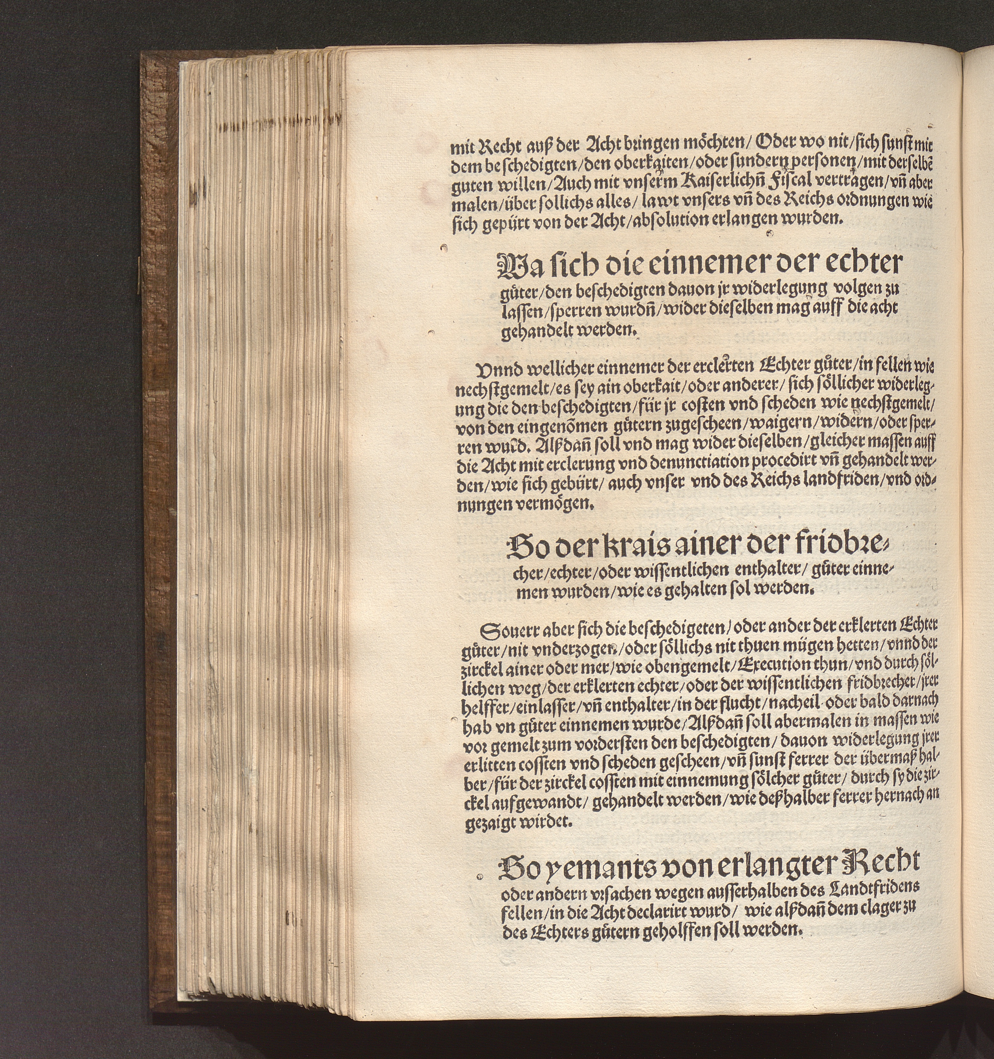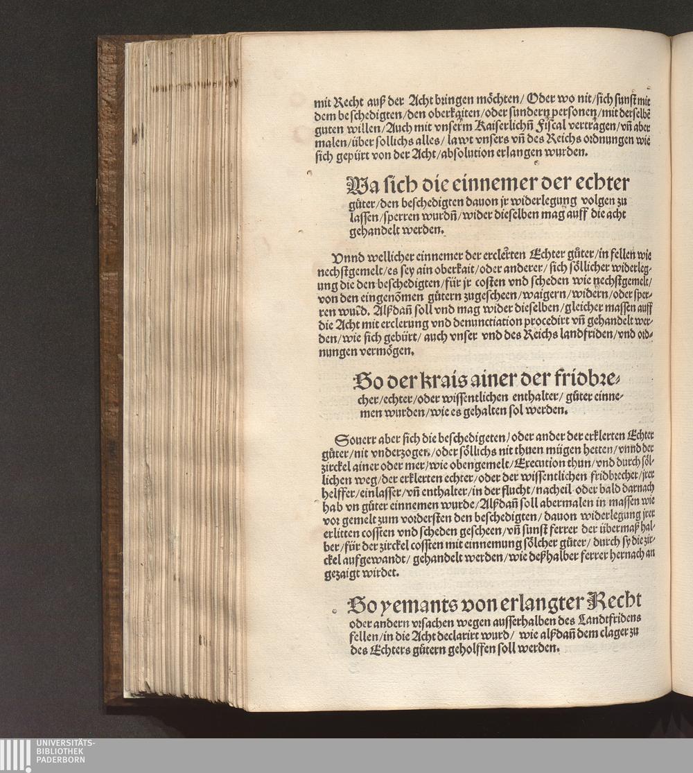 Romischer Kayserlicher Maiestat || ordnungen fürsehungen vn[d] erclerungen/ wie allenthalben || im hailigen Reich/ vnd sunderlich Teütscher Nation/ wi-||der die manigfeltigen vergweltiger/ beschediger/ vnd || des hayligen Reichs landtfridens verprecher/ darzu || desselben declarirt Echter. Auch ander ... || mit gepüren-||der straff ... || gehan-||delt wer-||den sol || ... : [Fünfzehenhundert vn[d] im zwayvndzwaintzigst[e]n. ... Jaren]