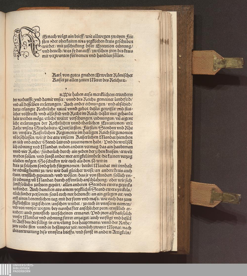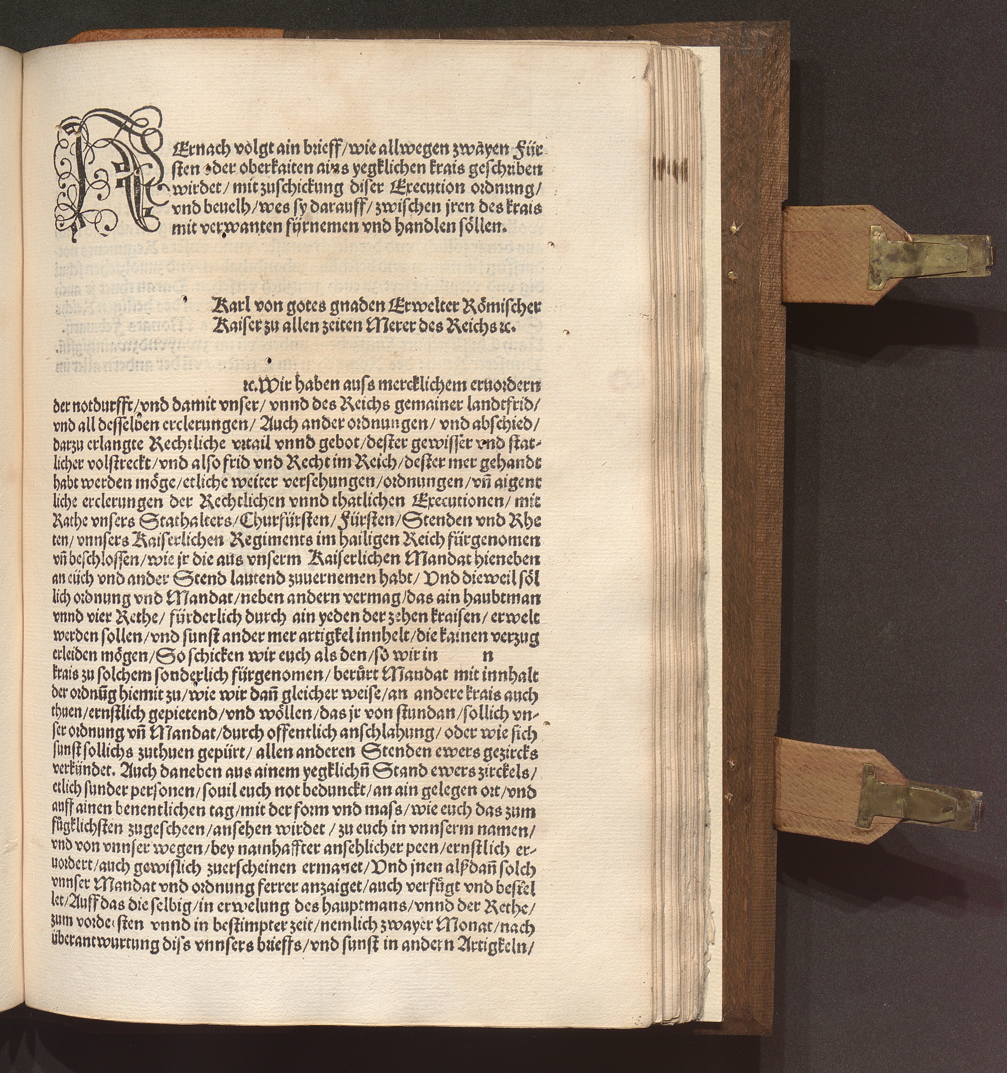Romischer Kayserlicher Maiestat || ordnungen fürsehungen vn[d] erclerungen/ wie allenthalben || im hailigen Reich/ vnd sunderlich Teütscher Nation/ wi-||der die manigfeltigen vergweltiger/ beschediger/ vnd || des hayligen Reichs landtfridens verprecher/ darzu || desselben declarirt Echter. Auch ander ... || mit gepüren-||der straff ... || gehan-||delt wer-||den sol || ... : [Fünfzehenhundert vn[d] im zwayvndzwaintzigst[e]n. ... Jaren]