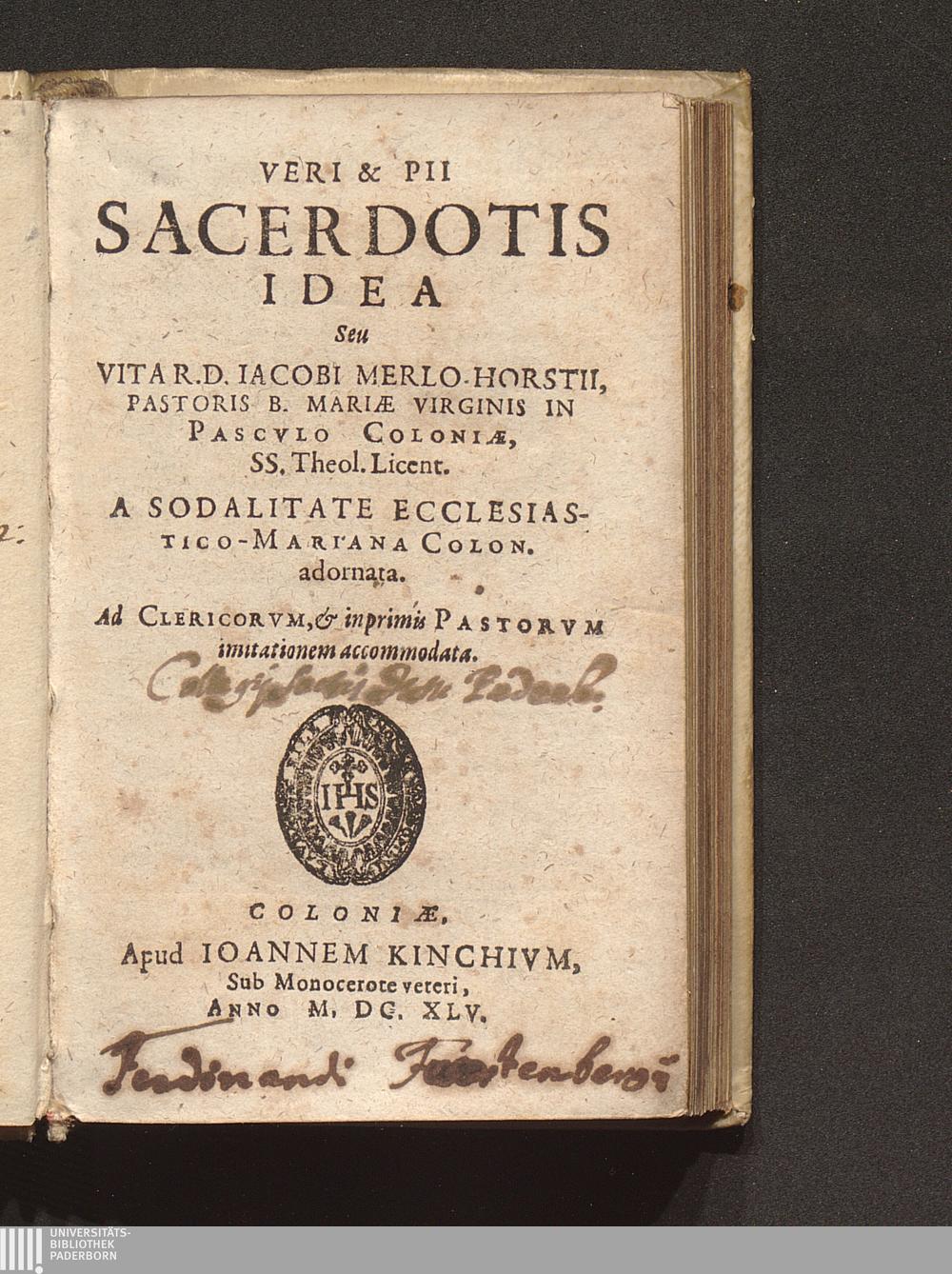 Veri & Pii Sacerdotis Idea Seu Vita R. D. Iacobi Merlo-Horstii, Pastoris B. Mariæ Virginis In Pascvlo Coloniæ, SS. Theol. Licent. / [Hermann Crombach. Johann Kinckius]