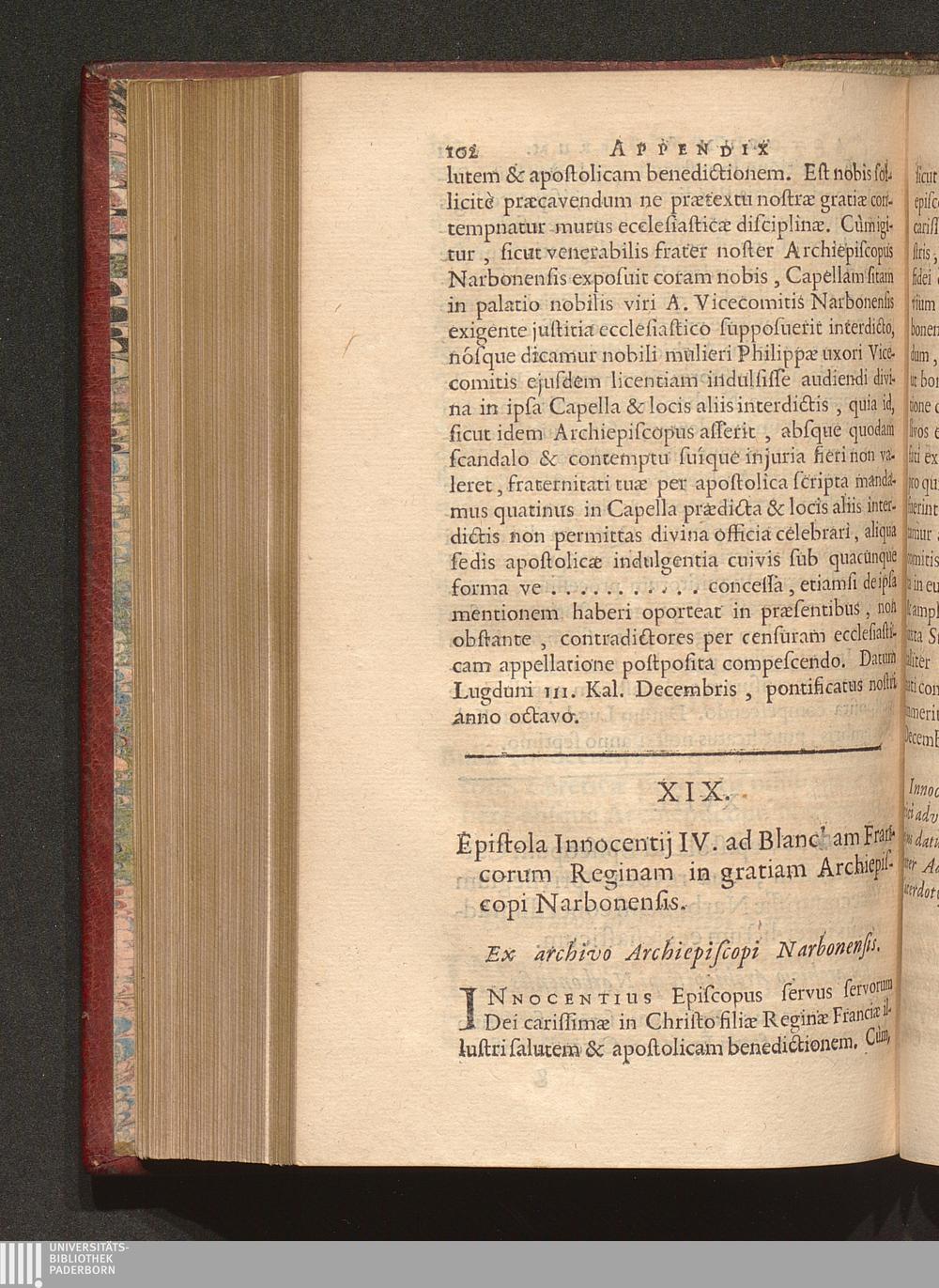 XIX. Epistola Innocentij IV. ad Blancham Francorum Reginam in gratiam Archiepiscopi[...]