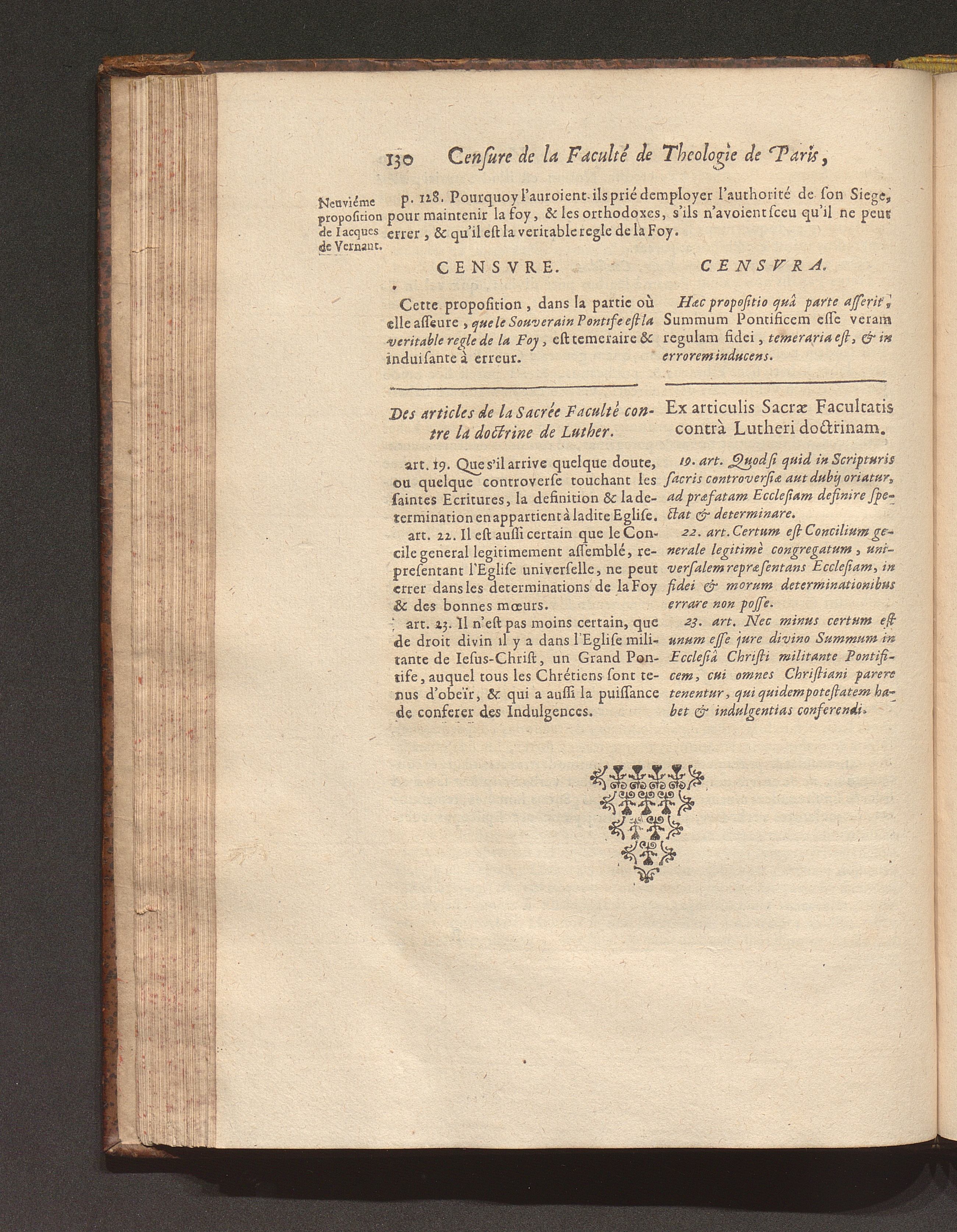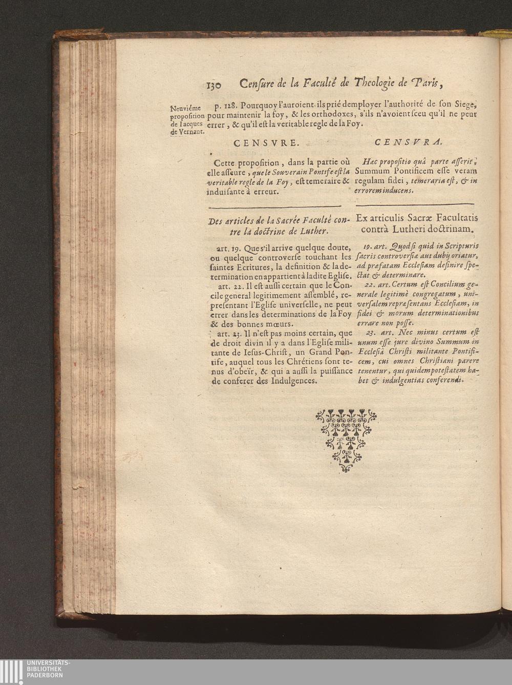 Censvra Sacræ Facvltatis Theologiæ Parisiensis, In Librum cui titulus est: La Défense de l'authorité de N. S. P. le Pape, ..., contre les erreurs de ce temps, Par Iacqves De Vernant, à Mets, 1658 : Confirmata Ex Scriptvris Sacris, Conciliorum gestis & Canonibus ... / Operâ ac studio quorumdam Theologorum Parisiensium