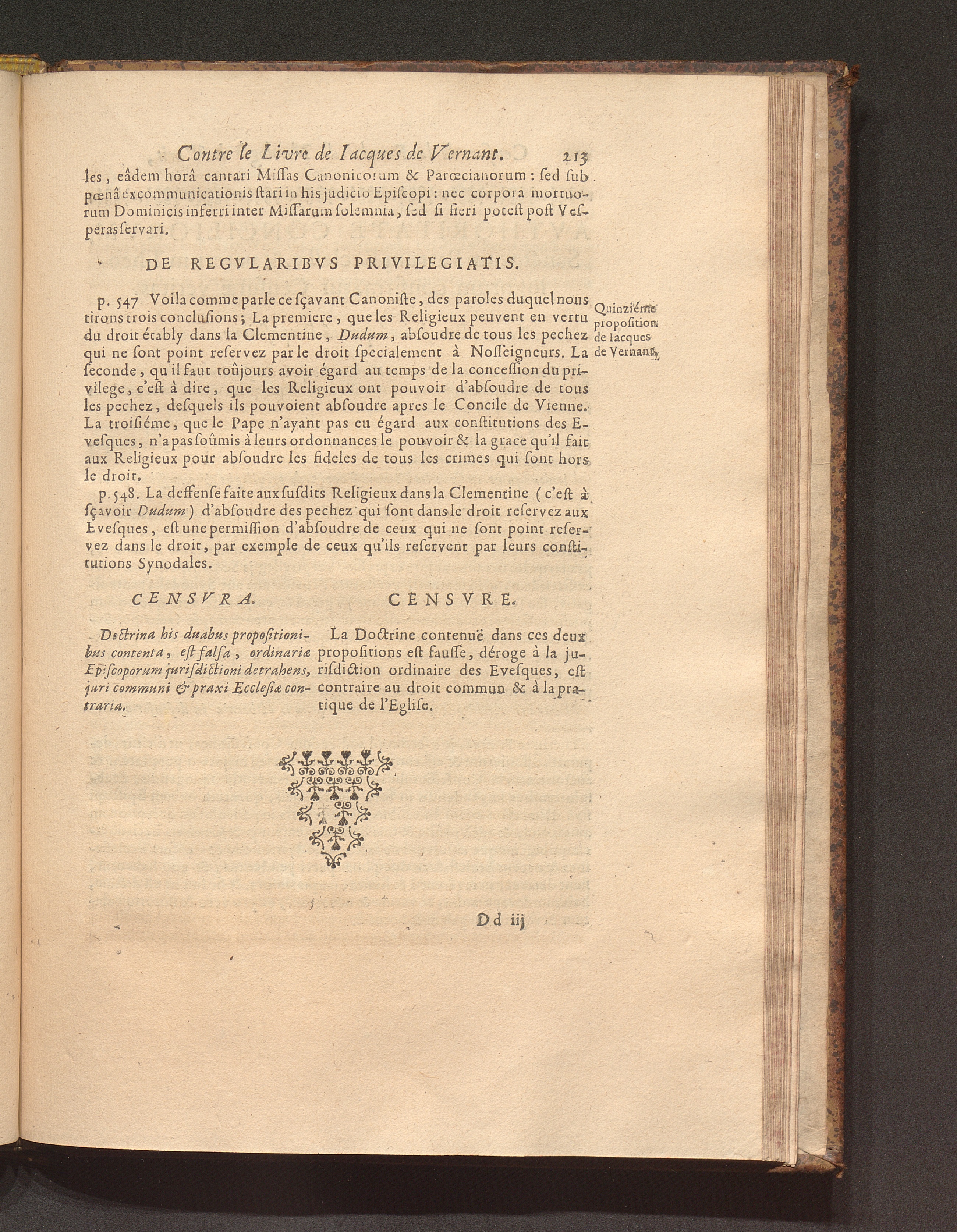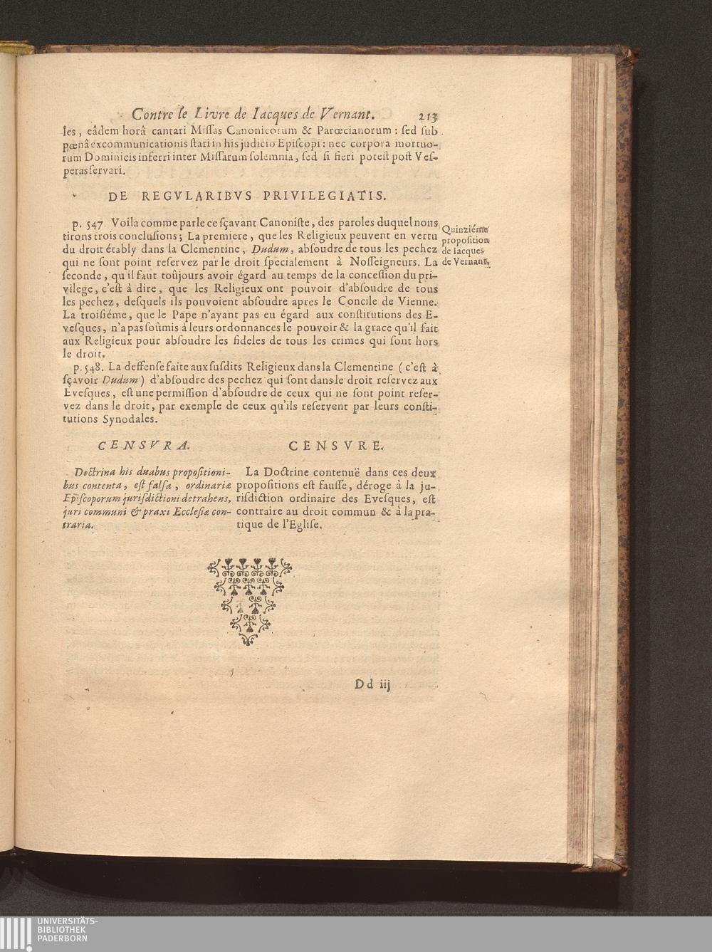 Censvra Sacræ Facvltatis Theologiæ Parisiensis, In Librum cui titulus est: La Défense de l'authorité de N. S. P. le Pape, ..., contre les erreurs de ce temps, Par Iacqves De Vernant, à Mets, 1658 : Confirmata Ex Scriptvris Sacris, Conciliorum gestis & Canonibus ... / Operâ ac studio quorumdam Theologorum Parisiensium