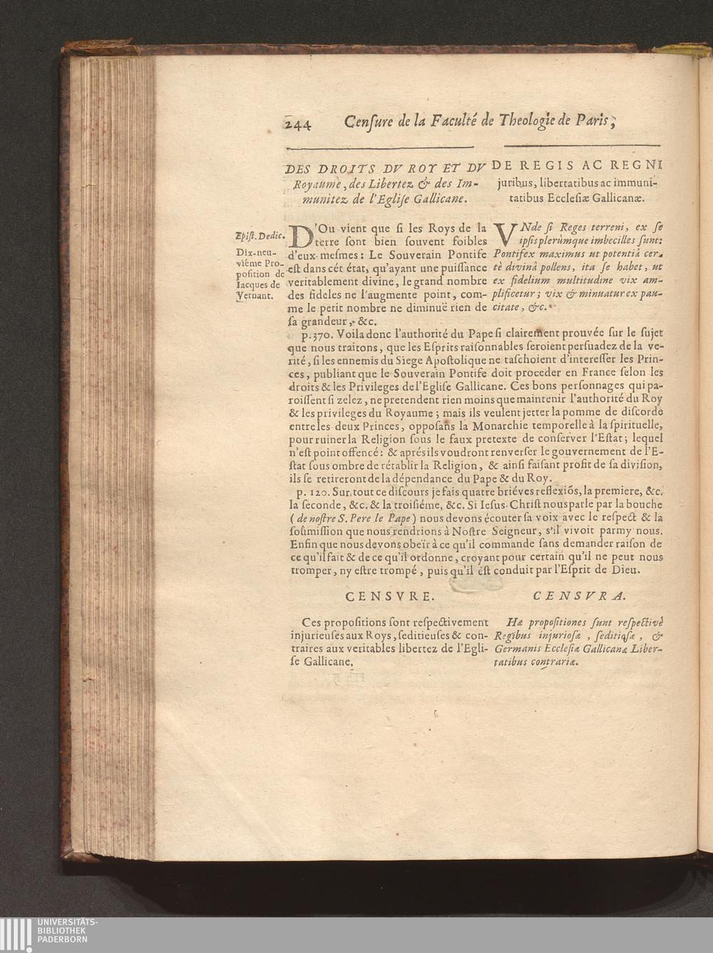 Censvra Sacræ Facvltatis Theologiæ Parisiensis, In Librum cui titulus est: La Défense de l'authorité de N. S. P. le Pape, ..., contre les erreurs de ce temps, Par Iacqves De Vernant, à Mets, 1658 : Confirmata Ex Scriptvris Sacris, Conciliorum gestis & Canonibus ... / Operâ ac studio quorumdam Theologorum Parisiensium