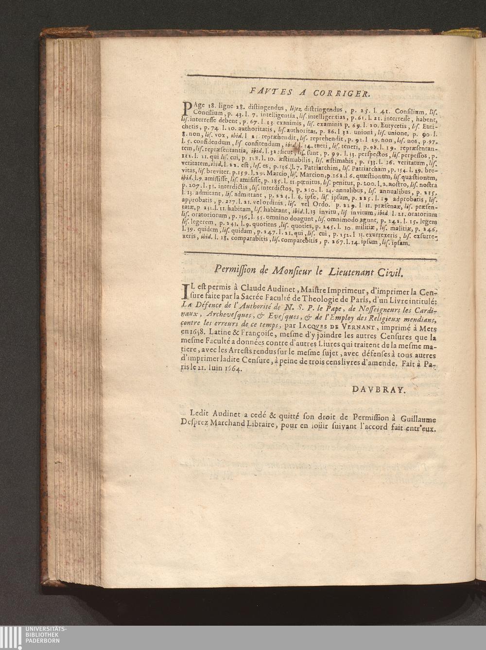Censvra Sacræ Facvltatis Theologiæ Parisiensis, In Librum cui titulus est: La Défense de l'authorité de N. S. P. le Pape, ..., contre les erreurs de ce temps, Par Iacqves De Vernant, à Mets, 1658 : Confirmata Ex Scriptvris Sacris, Conciliorum gestis & Canonibus ... / Operâ ac studio quorumdam Theologorum Parisiensium