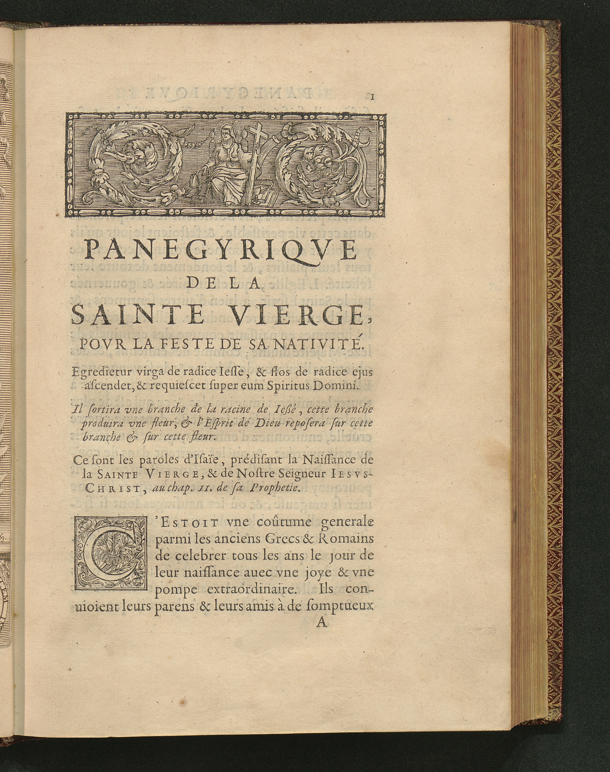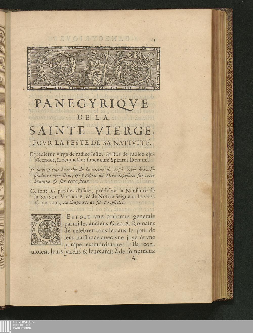 Panegyriqve De La Sainte Vierge, Povr La Feste De Sa Nativité. Egredietur virga de radice Iesse, & flos de radice ejus ascendet, & requiescet super eum Spiritus Domini.