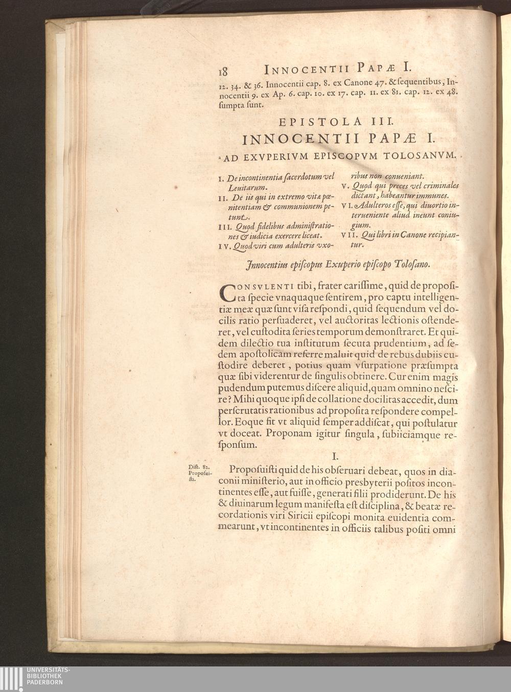 Epistola III. Innocentii Papae I. Ad Exvperivm Episcopvm Tolosanvm.