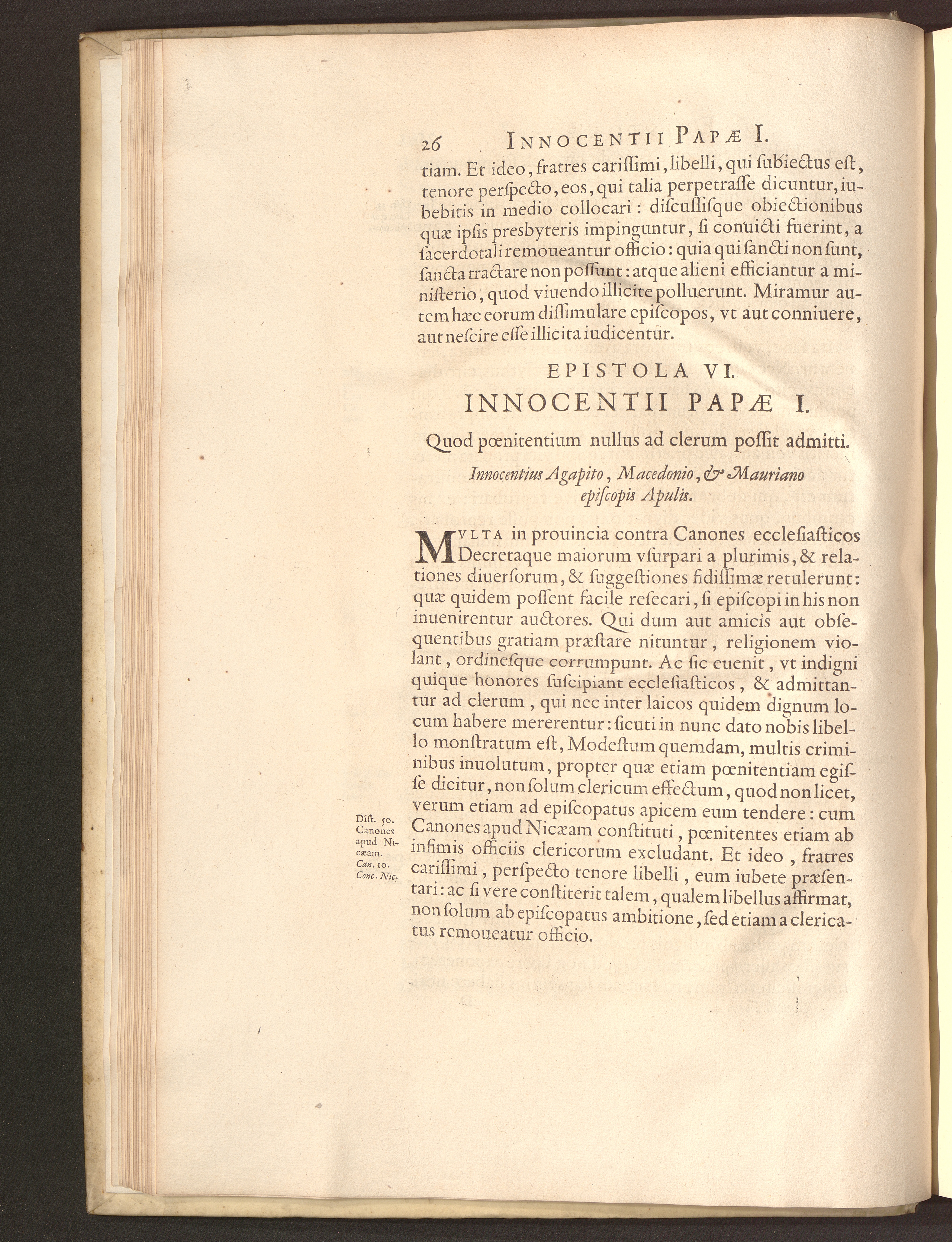 Epistola VI. Innocentii Papae I. Quod poenitentium nullus ad clerum possit admit[...]