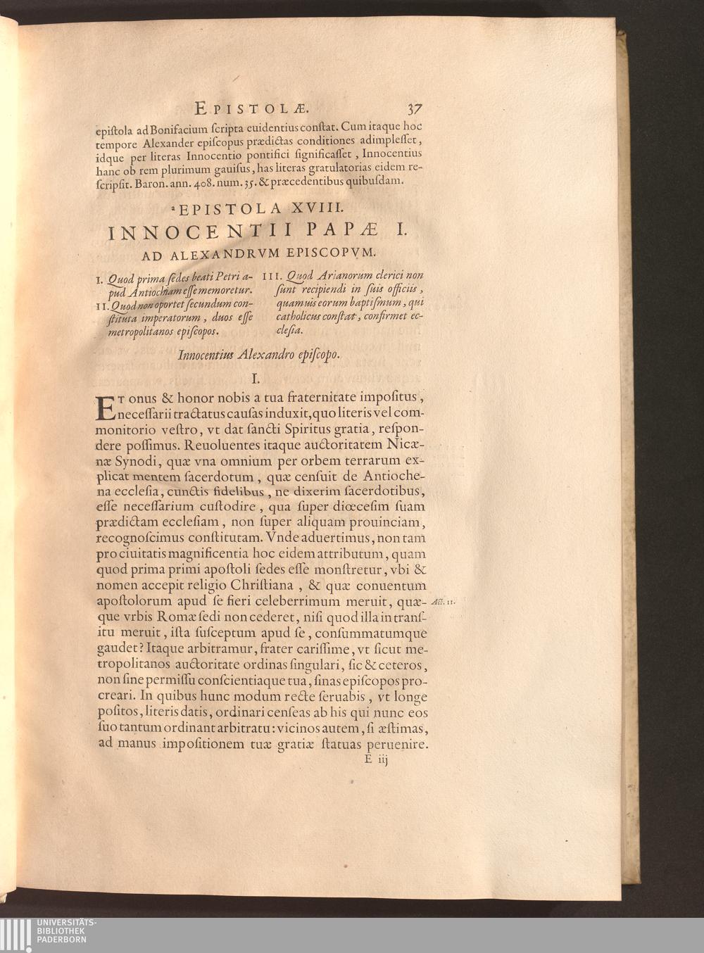 Epistola XVIII. Innocentii Papae I. Ad Alexandrvm Episcopvm.
