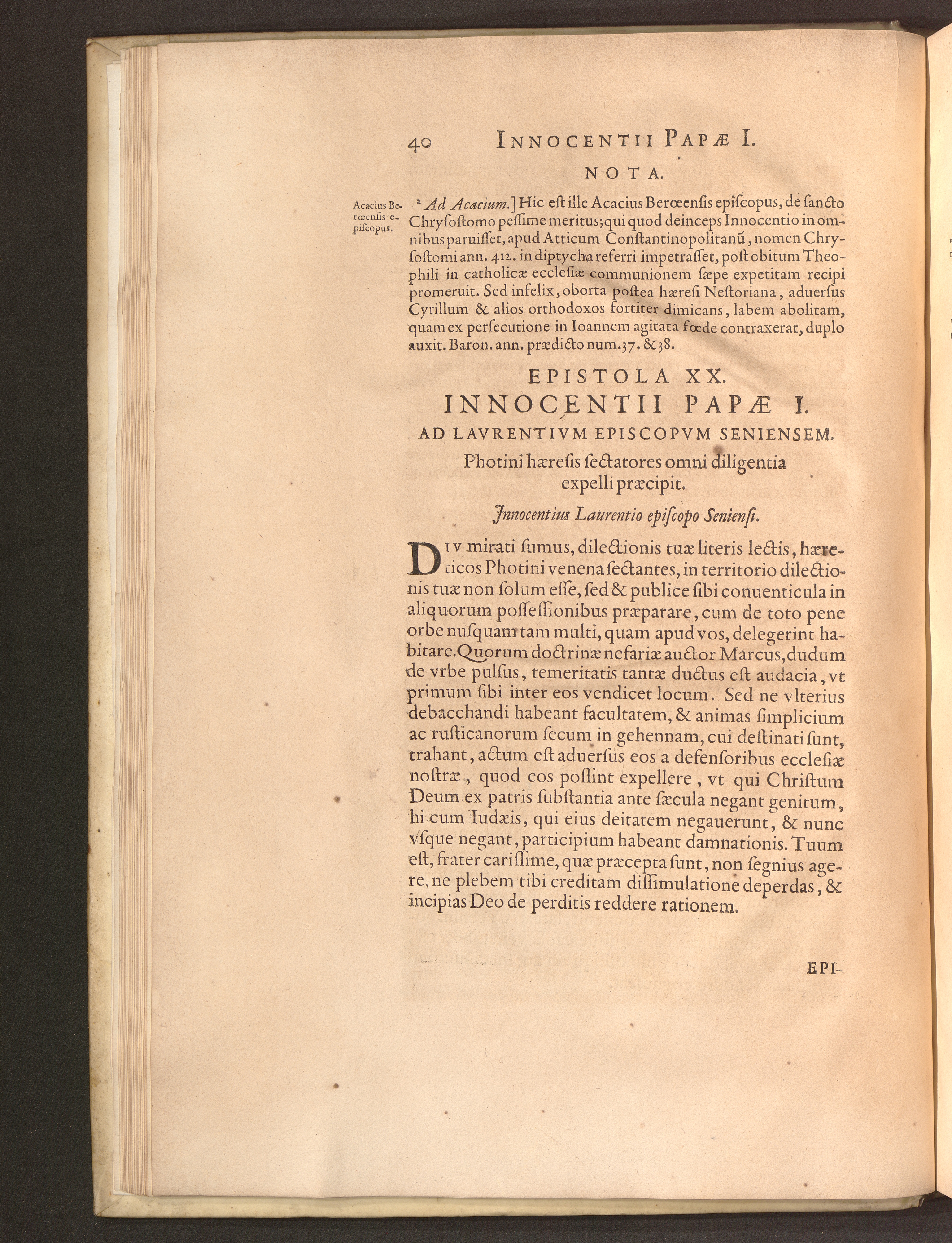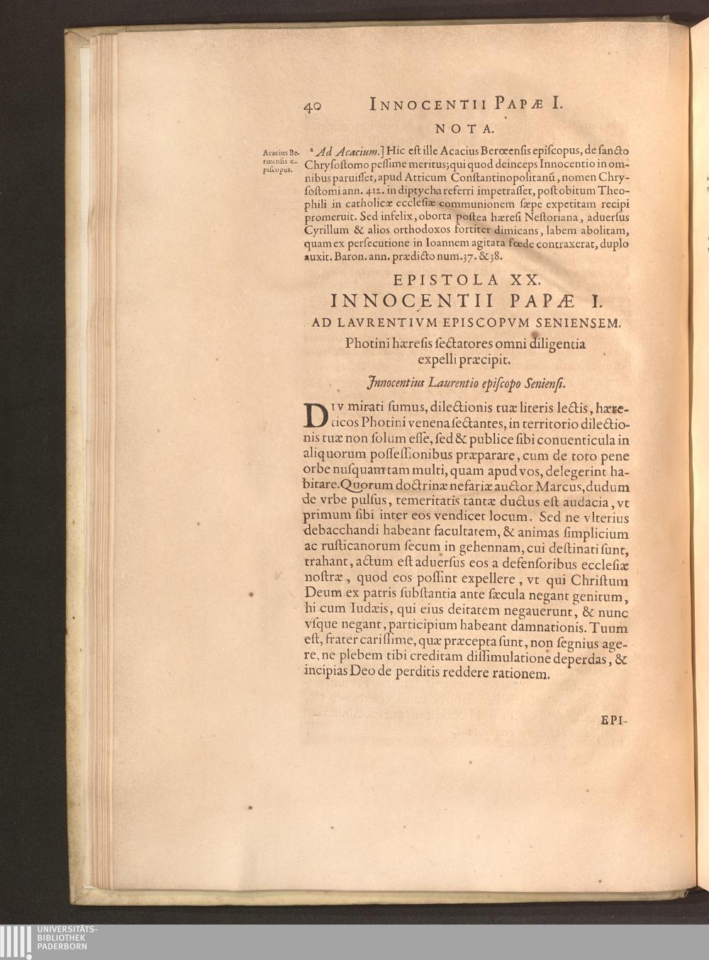 Epistola XX. Innocentii Papae I. Ad Lavrentivm Episcopvm Seniensem. Photini haeresis[...]