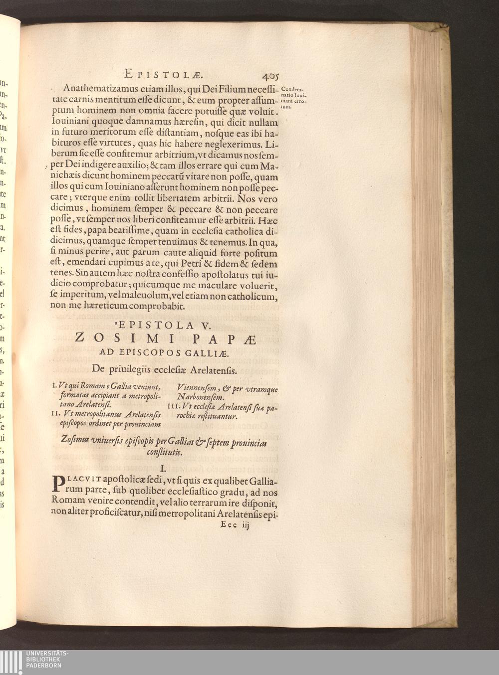 Epistola V. Zosimi Papae Ad Episcopos Galliae. De priulegiis ecclesiae Arelatens[...]