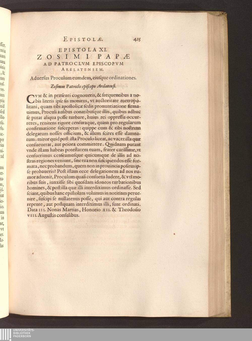 Epistola XI. Zosimi Papae Ad Patroclvm Episcopvm Arelatensem. Aduersus Proculum eumdem,[...]