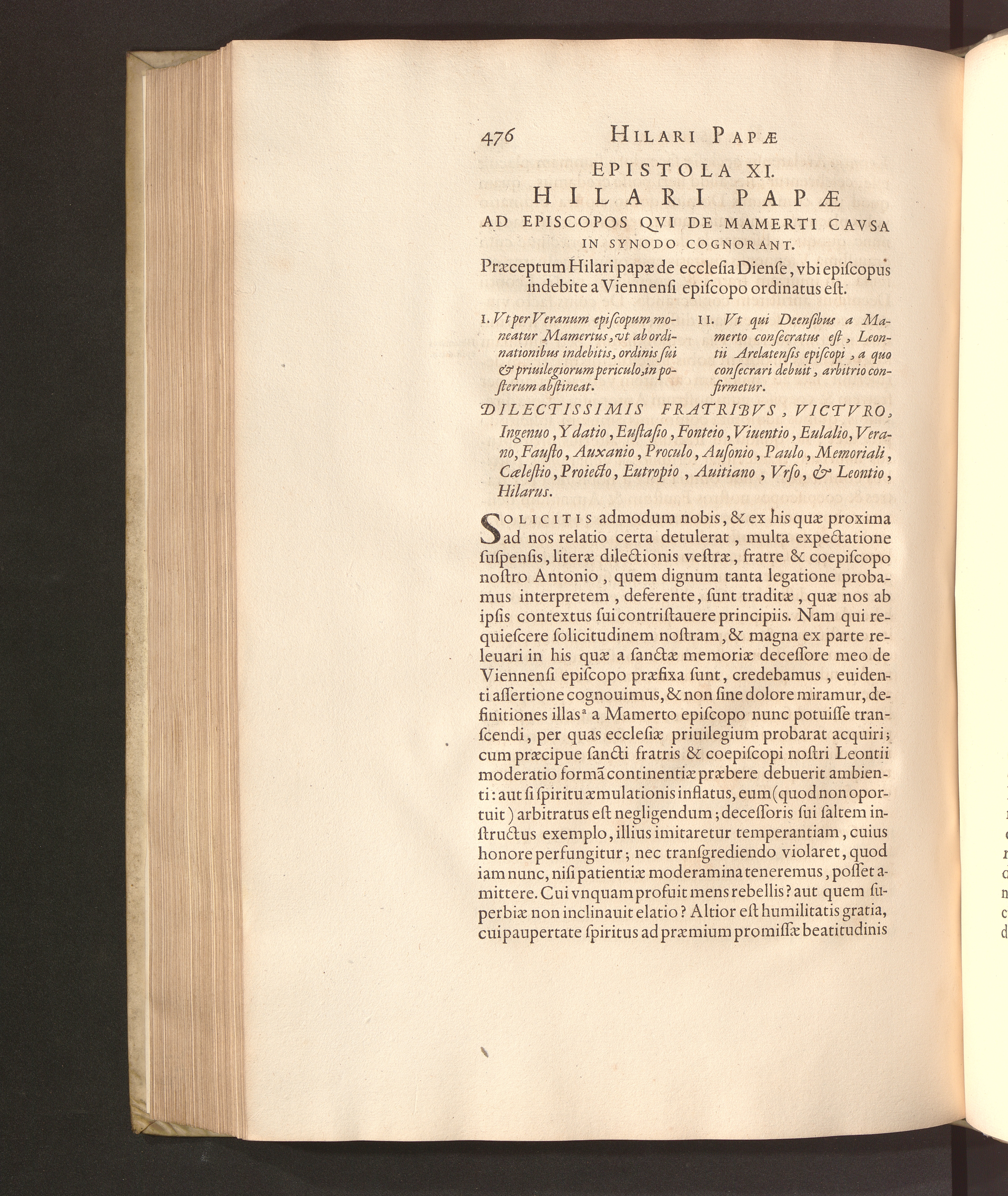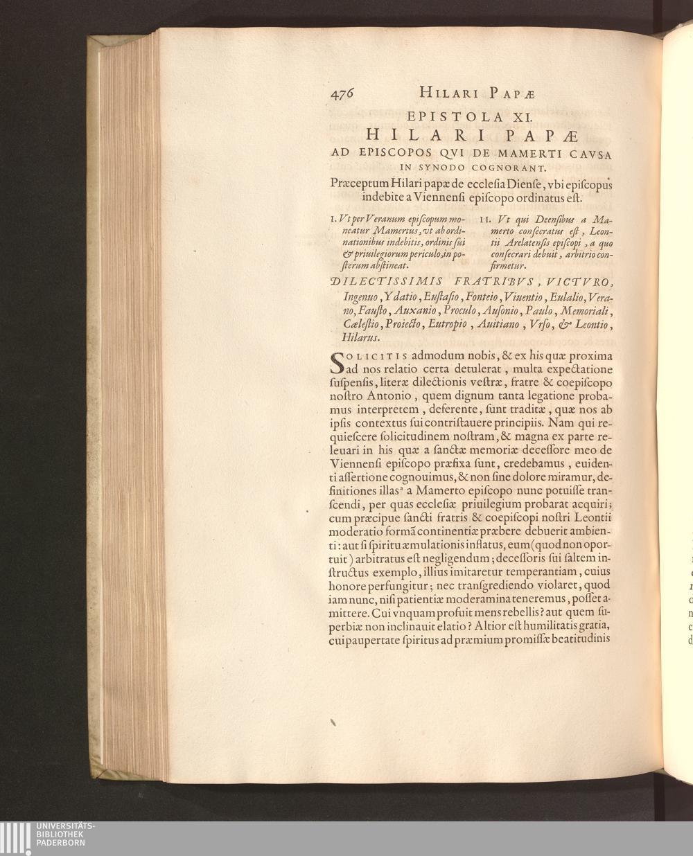 Epistola XI. Hilari papæ ad episcopos Galliæ qui de Mamerti causa in Synodo cogn[...]