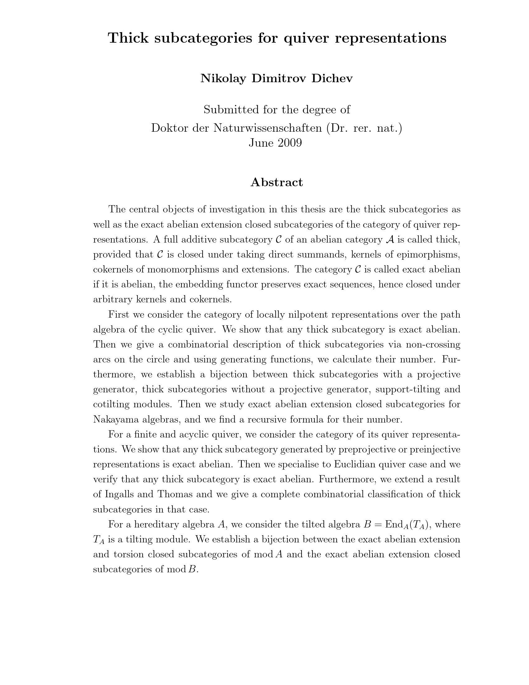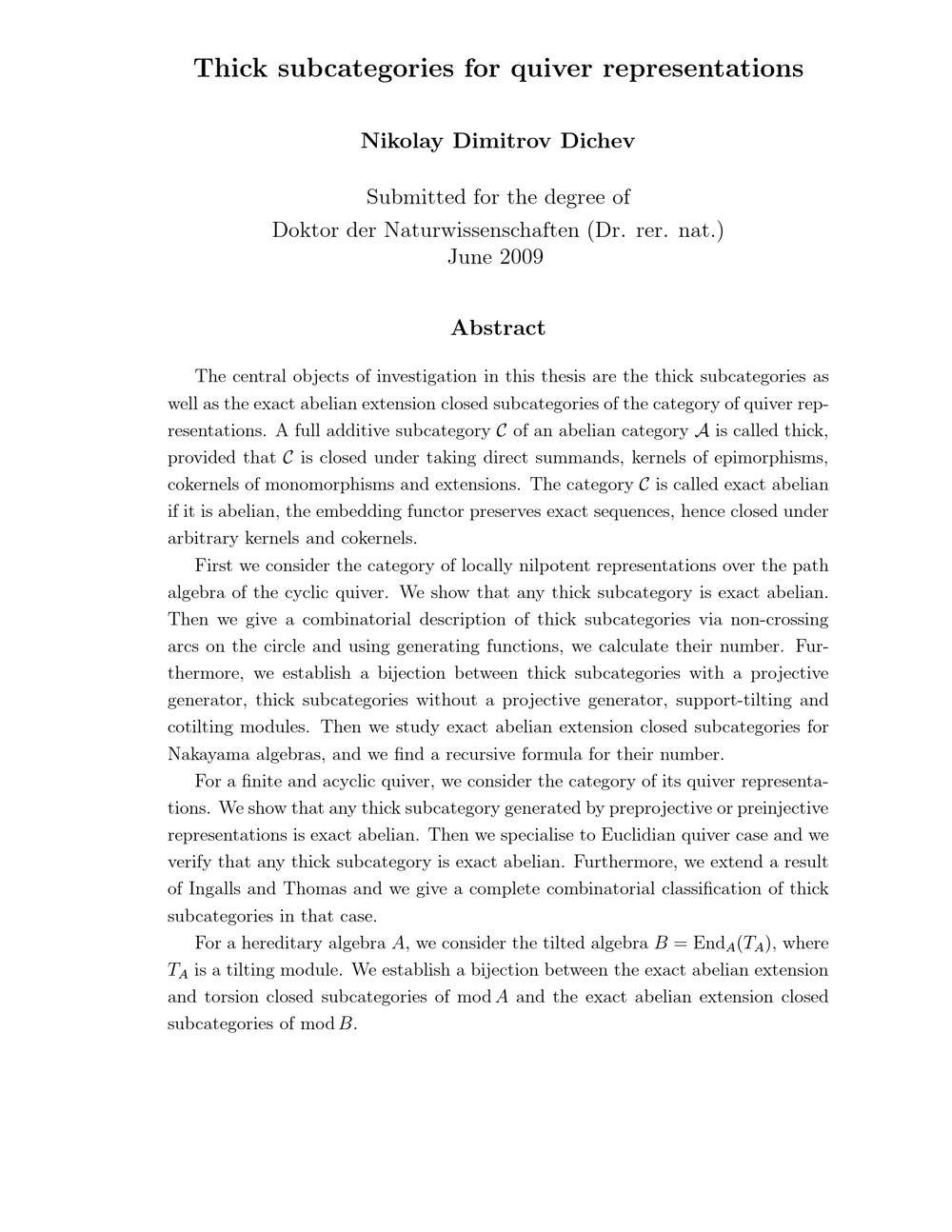 Thick subcategories for quiver representations / Nikolay Dimitrov Dichev