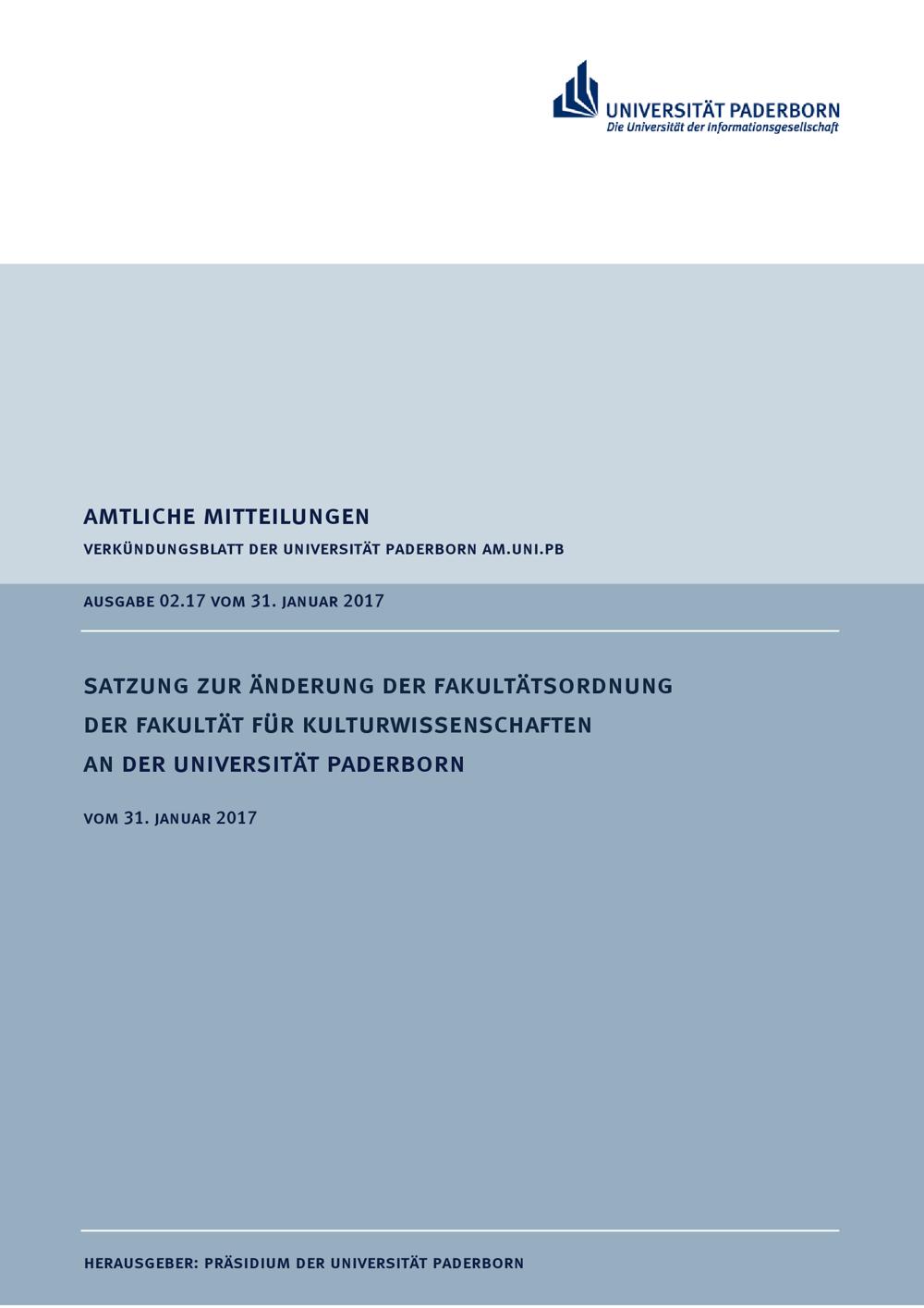 Satzung zur Änderung der Fakultätsordnung der Fakultät für Kulturwissenschaften an der Universität Paderborn : vom 31. Januar 2017
