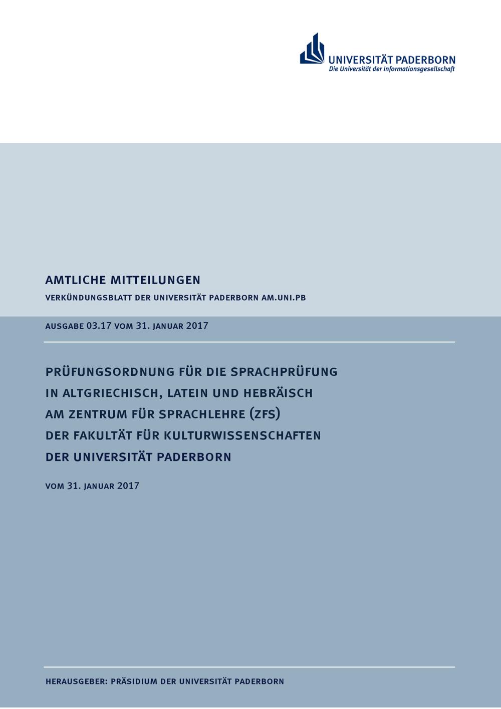 Prüfungsordnung für die Sprachprüfung in Altgriechisch, Latein und Hebräisch am Zentrum für Sprachlehre (ZfS) der Fakultät für Kulturwissenschaften der Universität Paderborn : vom 31. Januar 2017