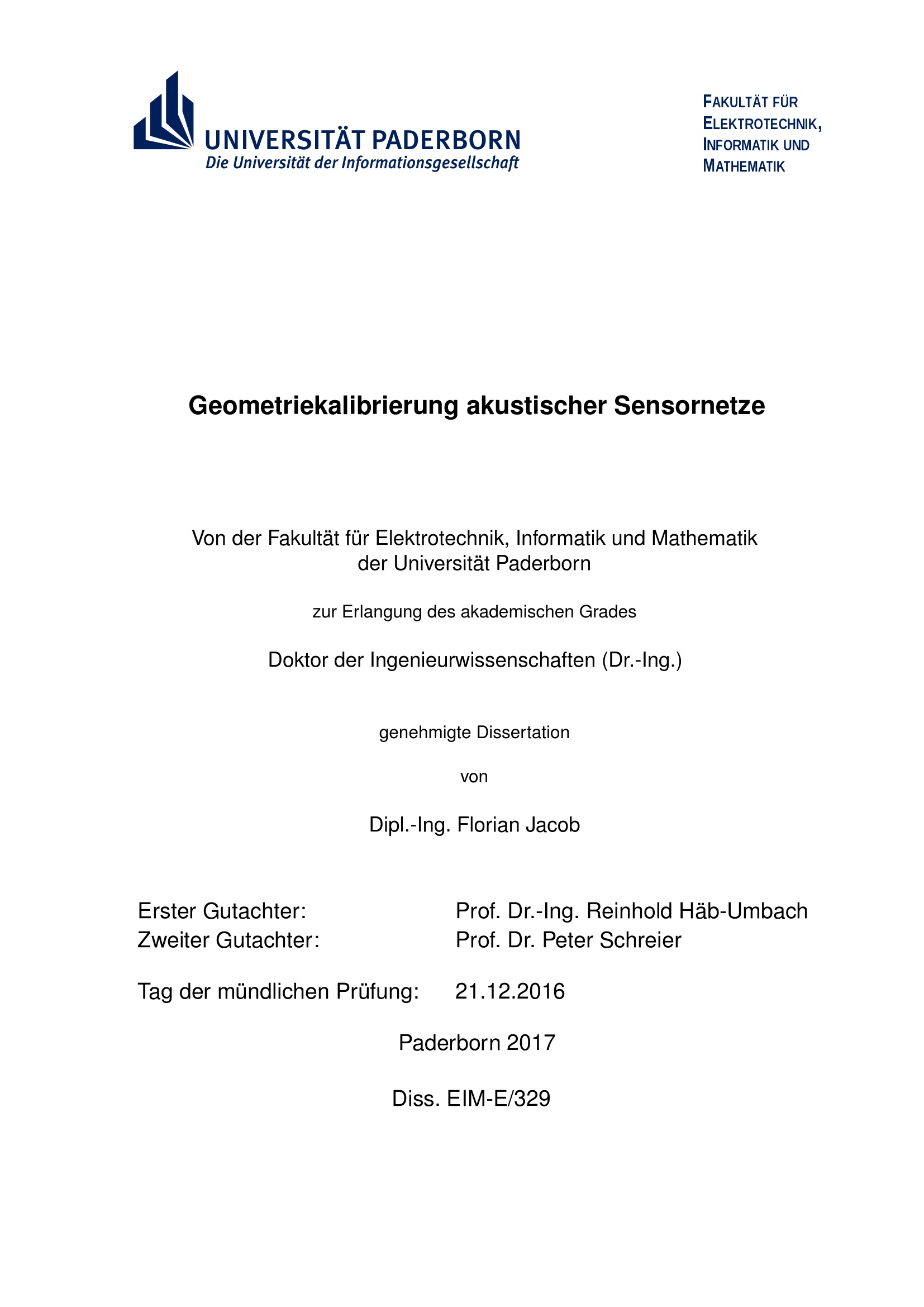 Geometriekalibrierung akustischer Sensornetze / von Dipl.-Ing. Florian Jacob ; Erster Gutachter: Prof. Dr.-Ing. Reinhold Häb-Umbach, Zweiter Gutachter: Prof. Dr. Peter Schreier