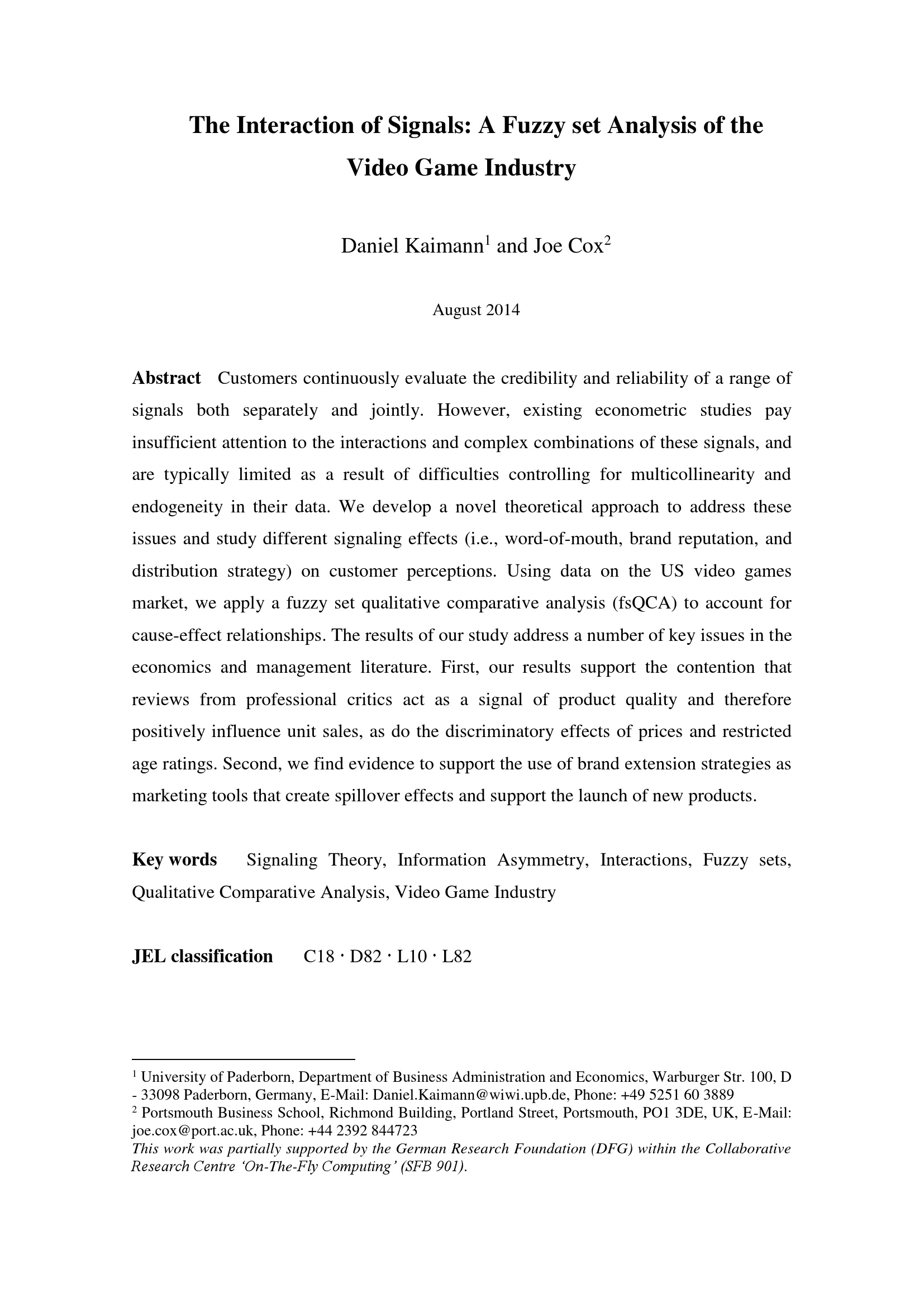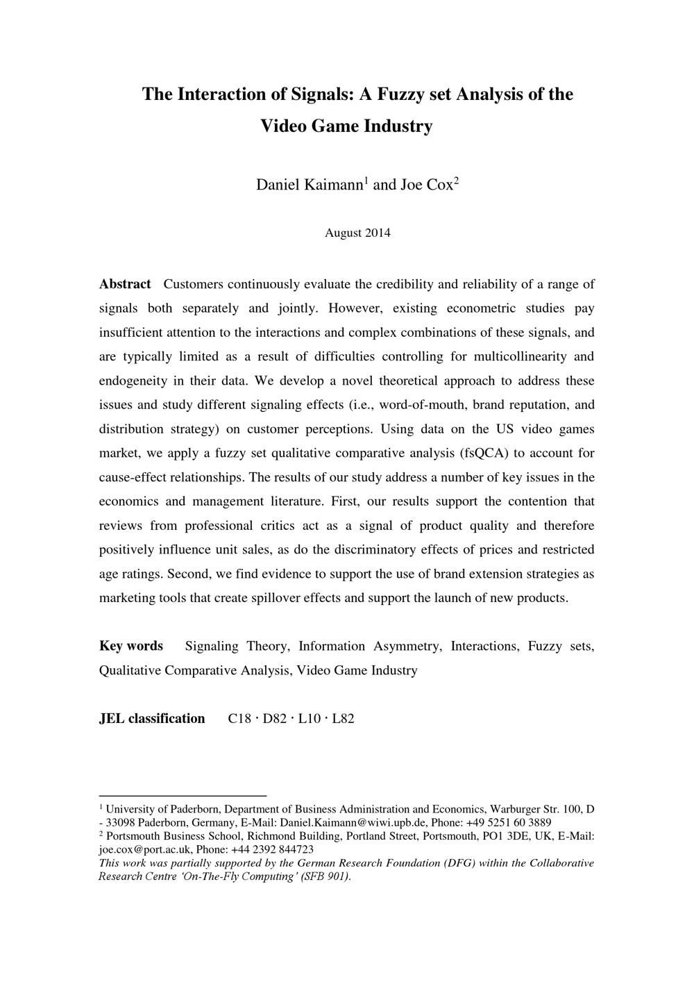 The interaction of signals : a fuzzy set analysis of the video game industry / Daniel Kaimann and Joe Cox