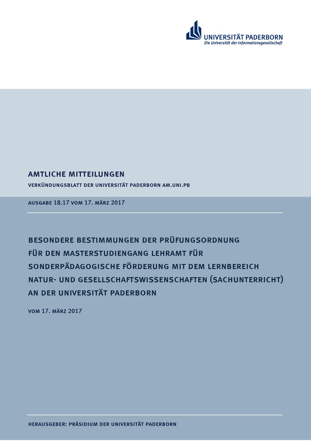 Besondere Bestimmungen der Prüfungsordnung für den Masterstudiengang Lehramt für sonderpädagogische Förderung mit dem Lernbereich Natur- und Gesellschaftswissenschaften (Sachunterricht) an der Universität Paderborn : vom 17. März 2017