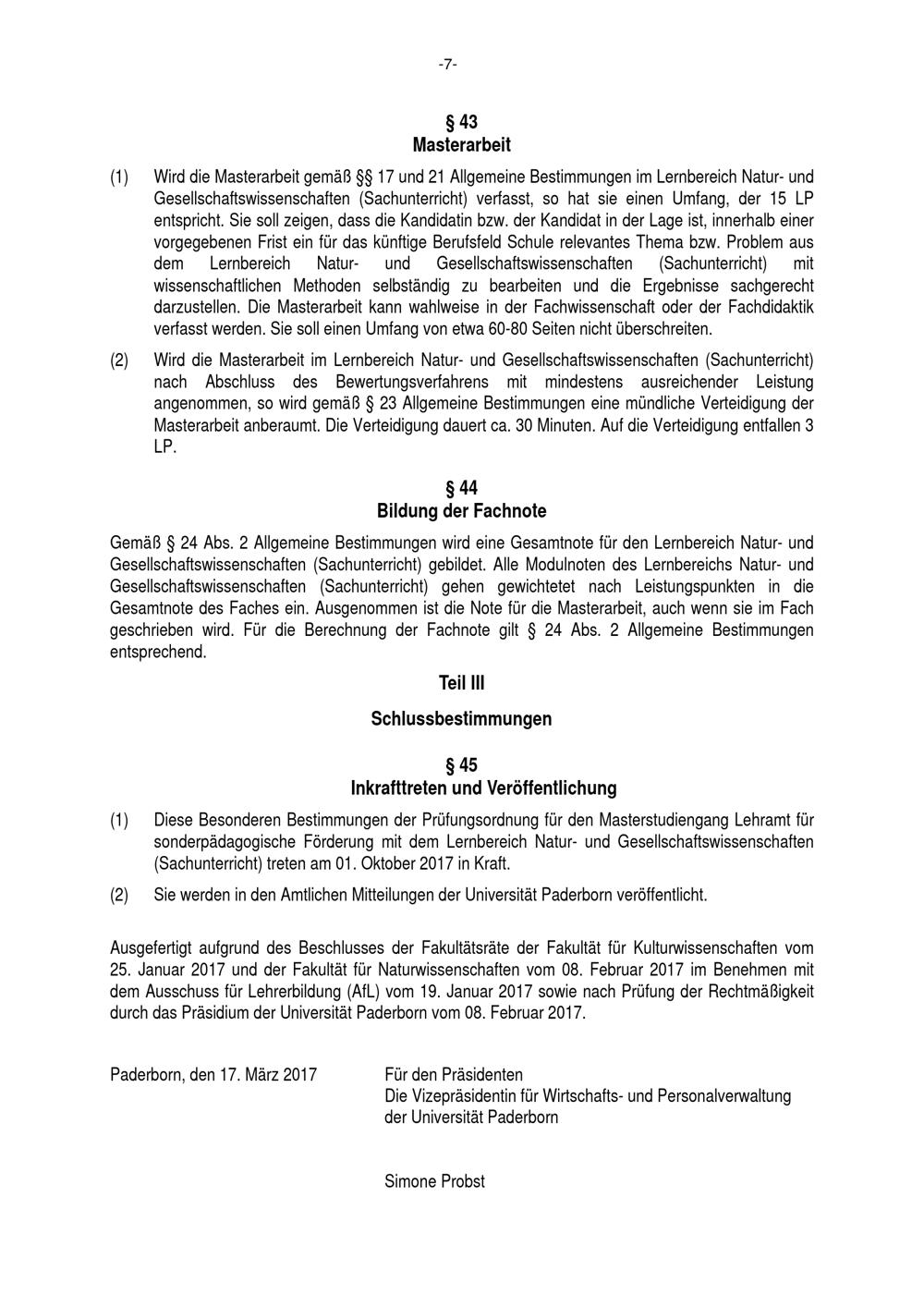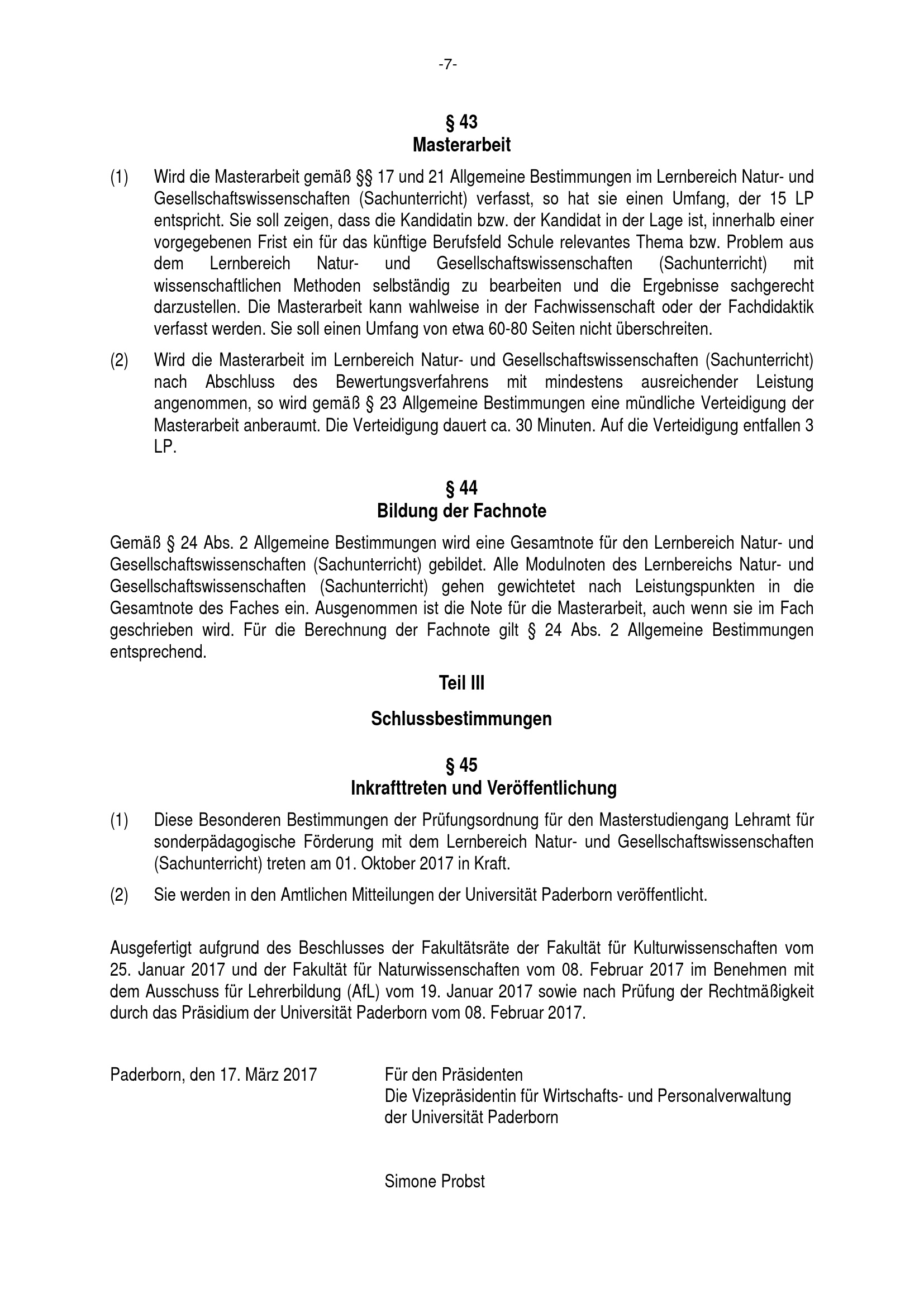 Besondere Bestimmungen der Prüfungsordnung für den Masterstudiengang Lehramt für sonderpädagogische Förderung mit dem Lernbereich Natur- und Gesellschaftswissenschaften (Sachunterricht) an der Universität Paderborn : vom 17. März 2017
