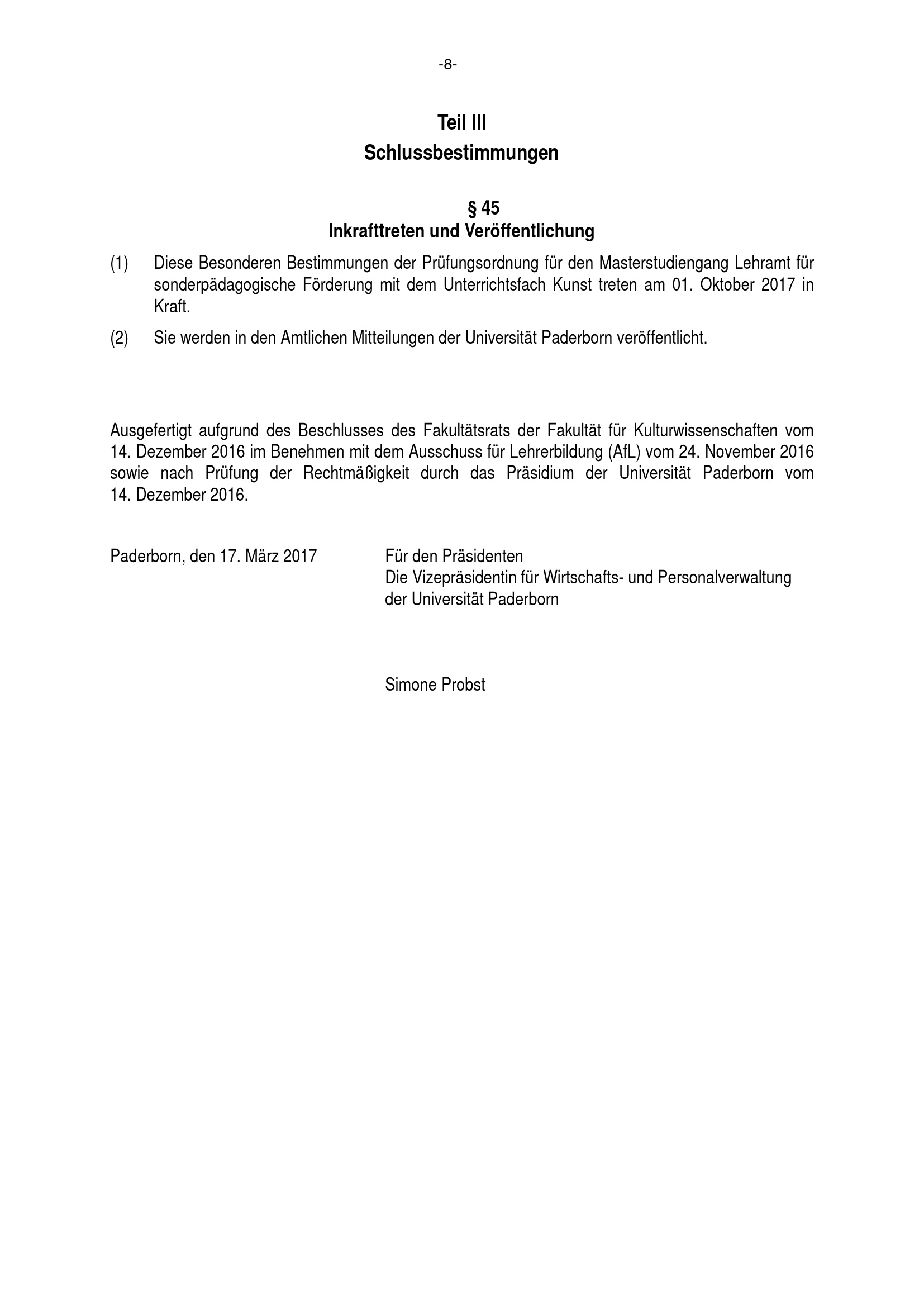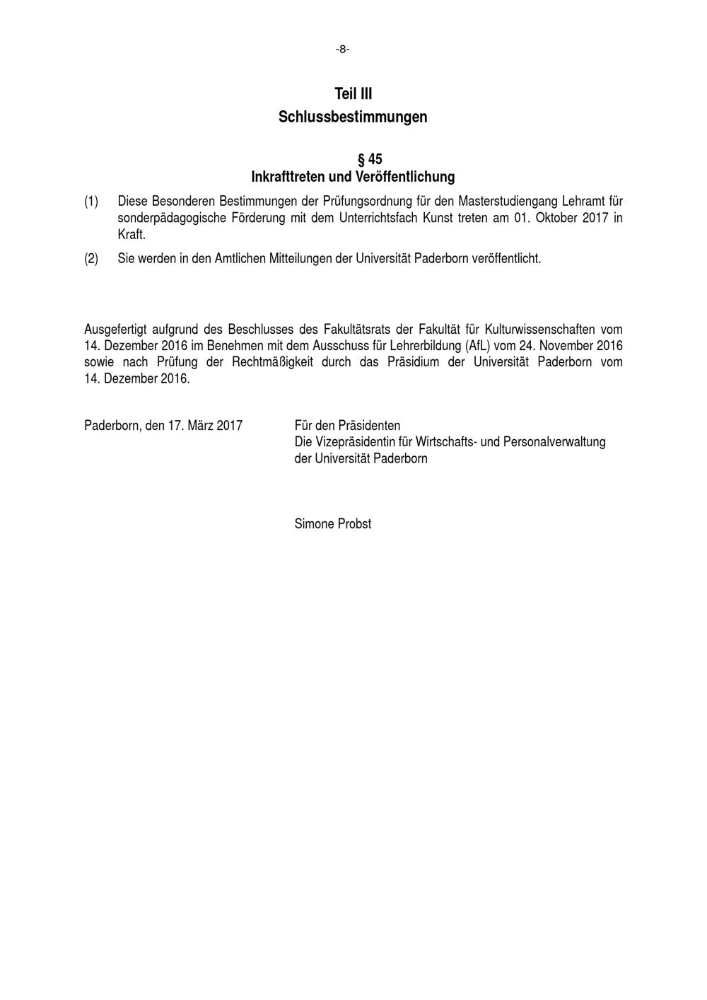 Besondere Bestimmungen der Prüfungsordnung für den Masterstudiengang Lehramt für sonderpädagogische Förderung mit dem Unterrichtsfach Kunst an der Universität Paderborn : vom 17. März 2017