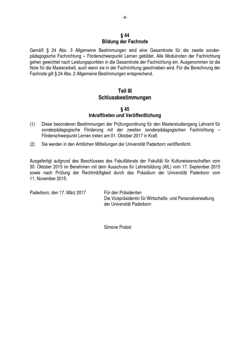 Besondere Bestimmungen der Prüfungsordnung für den Masterstudiengang Lehramt für sonderpädagogische Förderung mit der zweiten sonderpädagogischen Fachrichtung Förderschwerpunkt Lernen an der Universität Paderborn : vom 17. März 2017