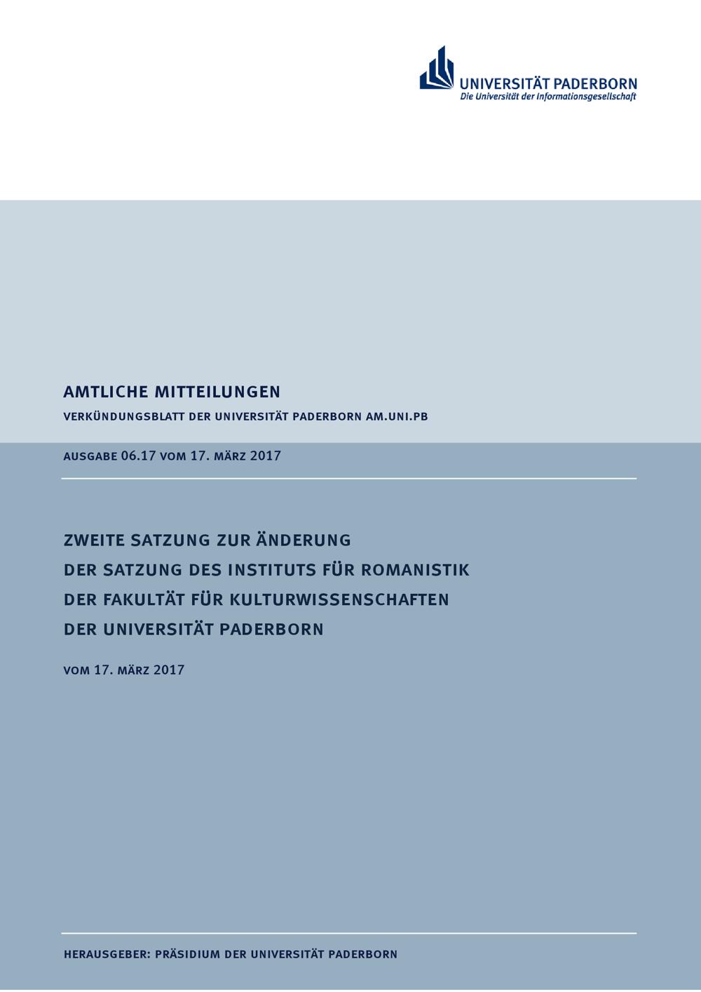 Zweite Satzung zur Änderung der Satzung des Instituts für Romanistik der Fakultät für Kulturwissenschaften der Universität Paderborn : vom 17. März 2017