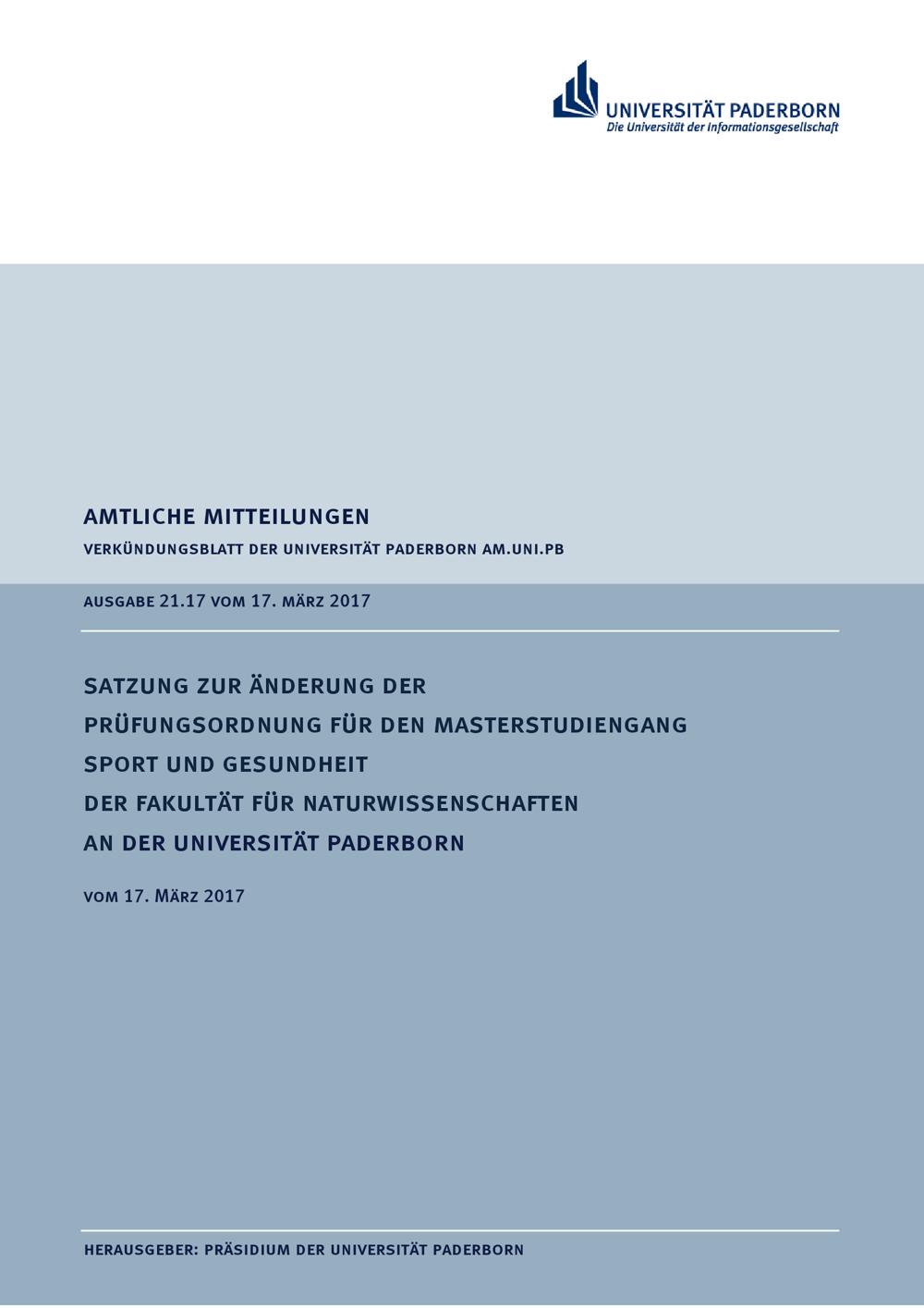 Satzung zur Änderung der Prüfungsordnung für den Masterstudiengang Sport und Gesundheit der Fakultät für Naturwissenschaften an der Universität Paderborn : vom 17. März 2017
