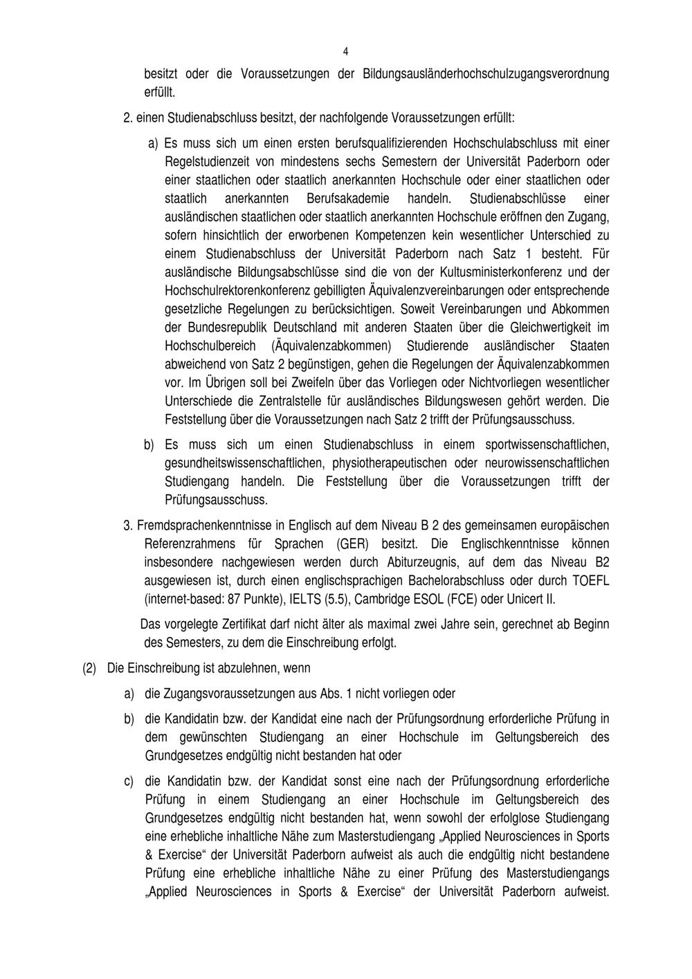 Prüfungsordnung für den Masterstudiengang Applied Neurosciences in Sports & Exercise der Fakultät für Naturwissenschaften an der Universität Paderborn : vom 10. April 2017