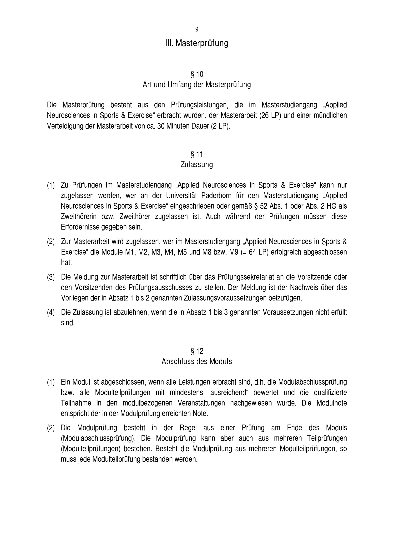 Prüfungsordnung für den Masterstudiengang Applied Neurosciences in Sports & Exercise der Fakultät für Naturwissenschaften an der Universität Paderborn : vom 10. April 2017