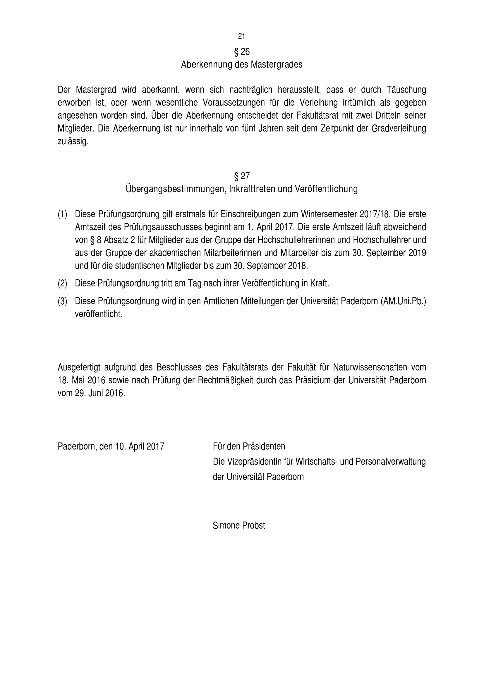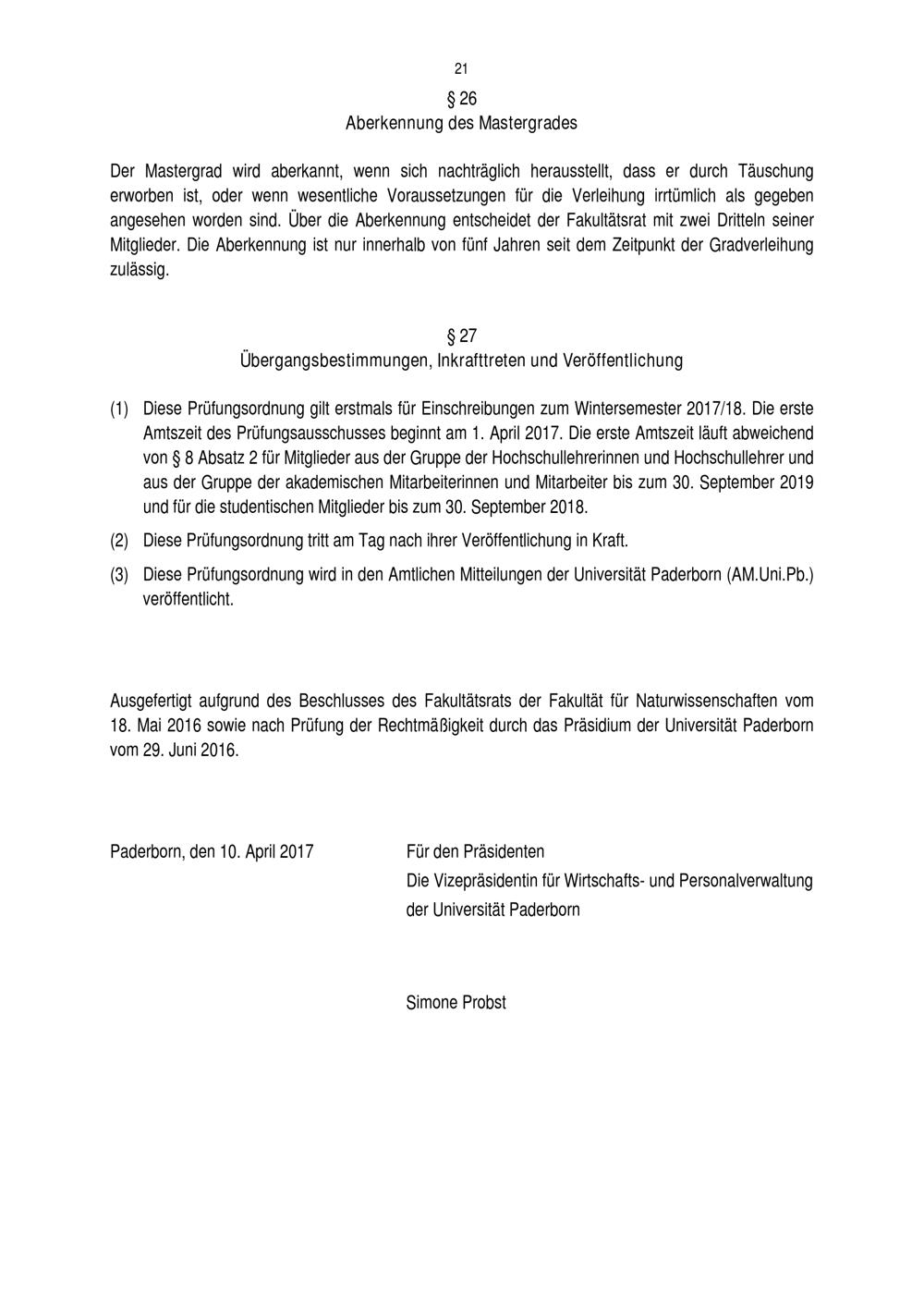 Prüfungsordnung für den Masterstudiengang Applied Neurosciences in Sports & Exercise der Fakultät für Naturwissenschaften an der Universität Paderborn : vom 10. April 2017
