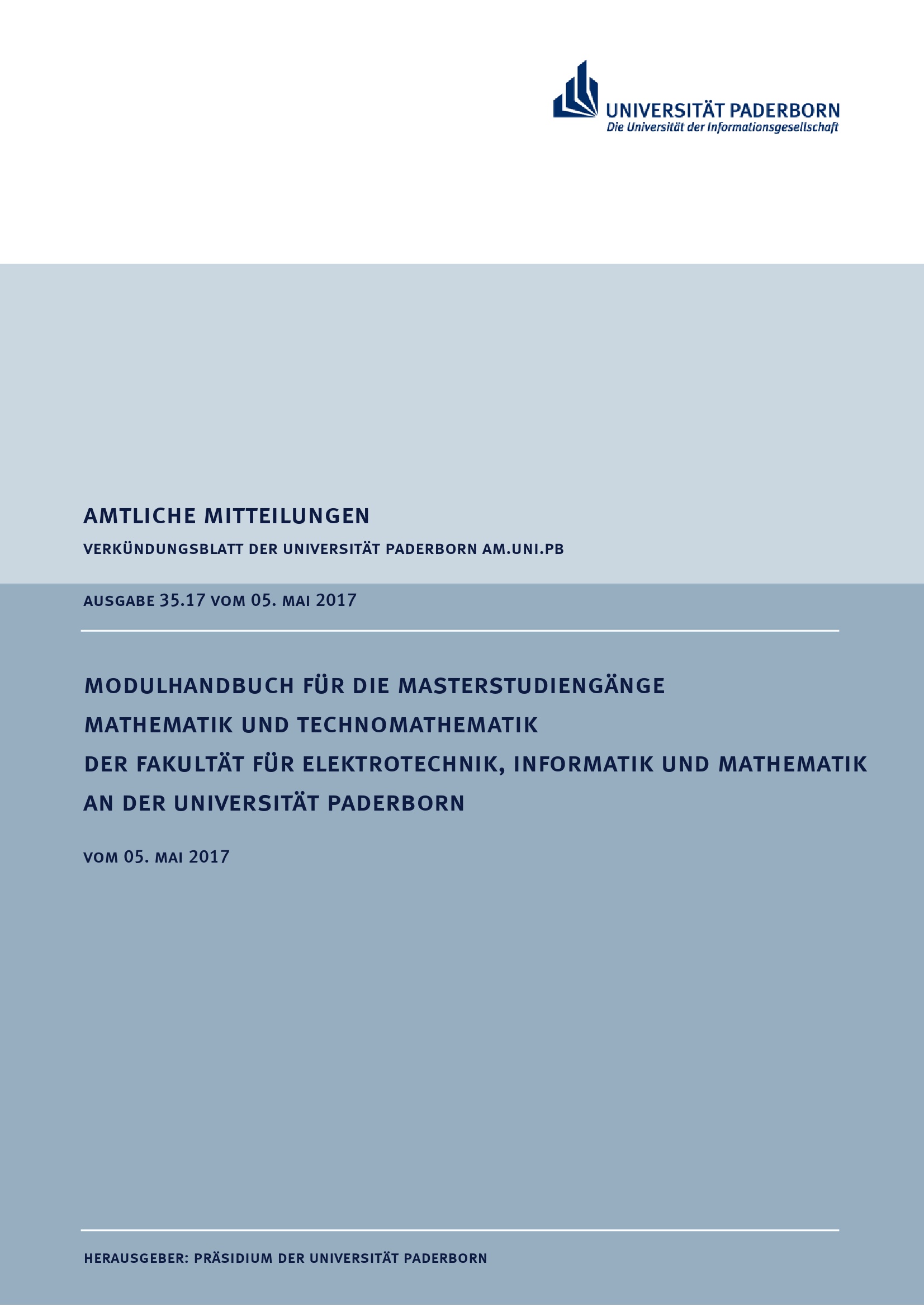 Modulhandbuch für die Masterstudiengänge Mathematik und Technomathematik der Fakultät für Elektrotechnik, Informatik und Mathematik an der Universität Paderborn : vom 05. Mai 2017