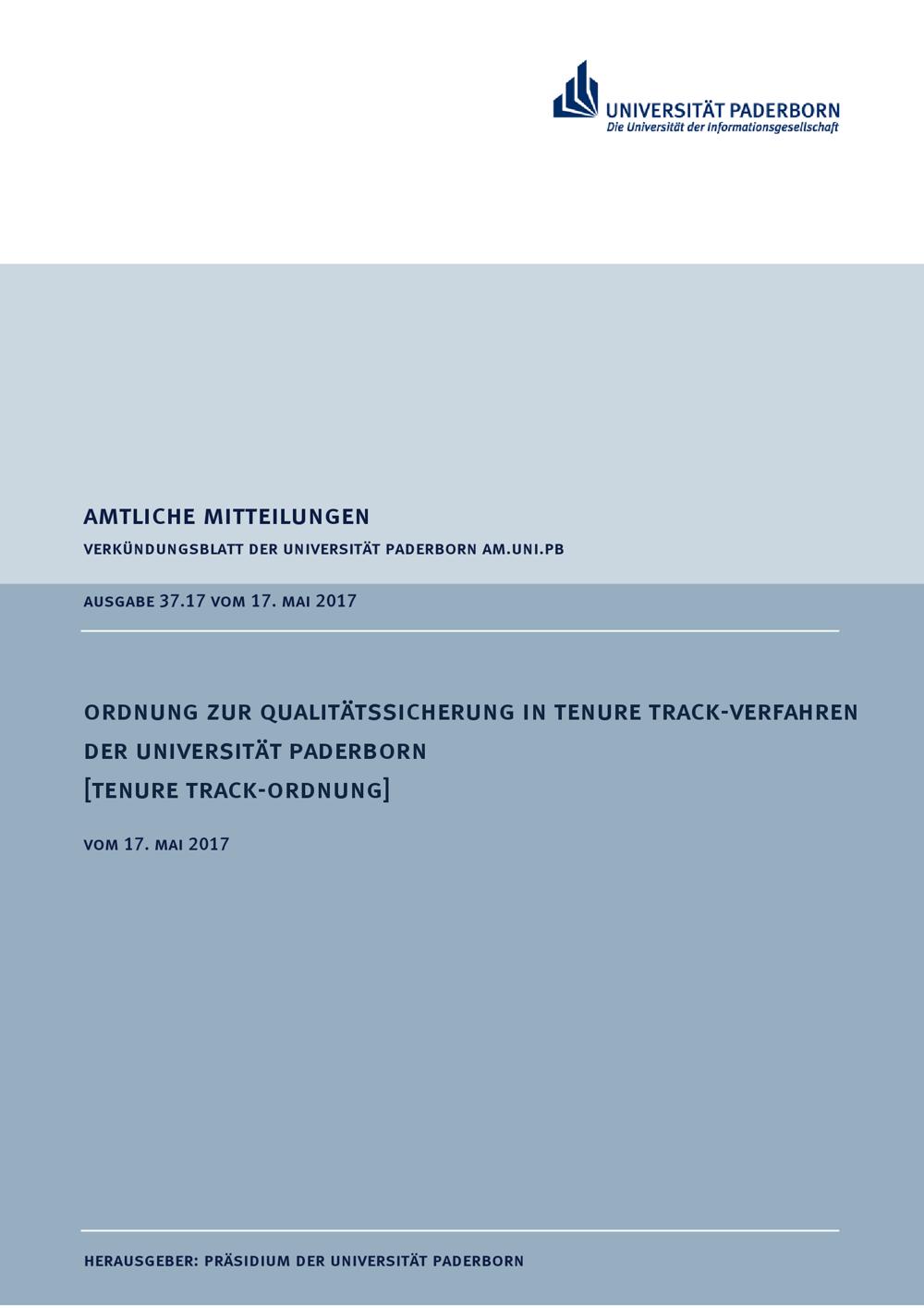 Ordnung zur Qualitätssicherung in Tenure Track-Verfahren der Universität Paderborn [Tenure Track-Ordnung] : vom 17. Mai 2017