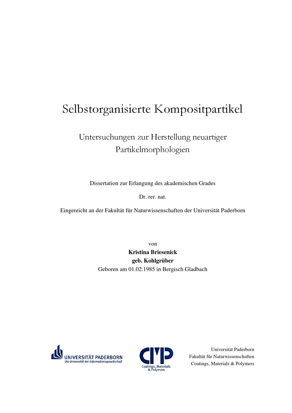 Selbstorganisierte Kompositpartikel : Untersuchungen zur Herstellung neuartiger Partikelmorphologien / von Kristina Briesenick ; [Erstgutachter: Prof. Dr. Wolfgang Bremser, Zweitgutachter: Prof. Dr. Hans-Joachim Warnecke]