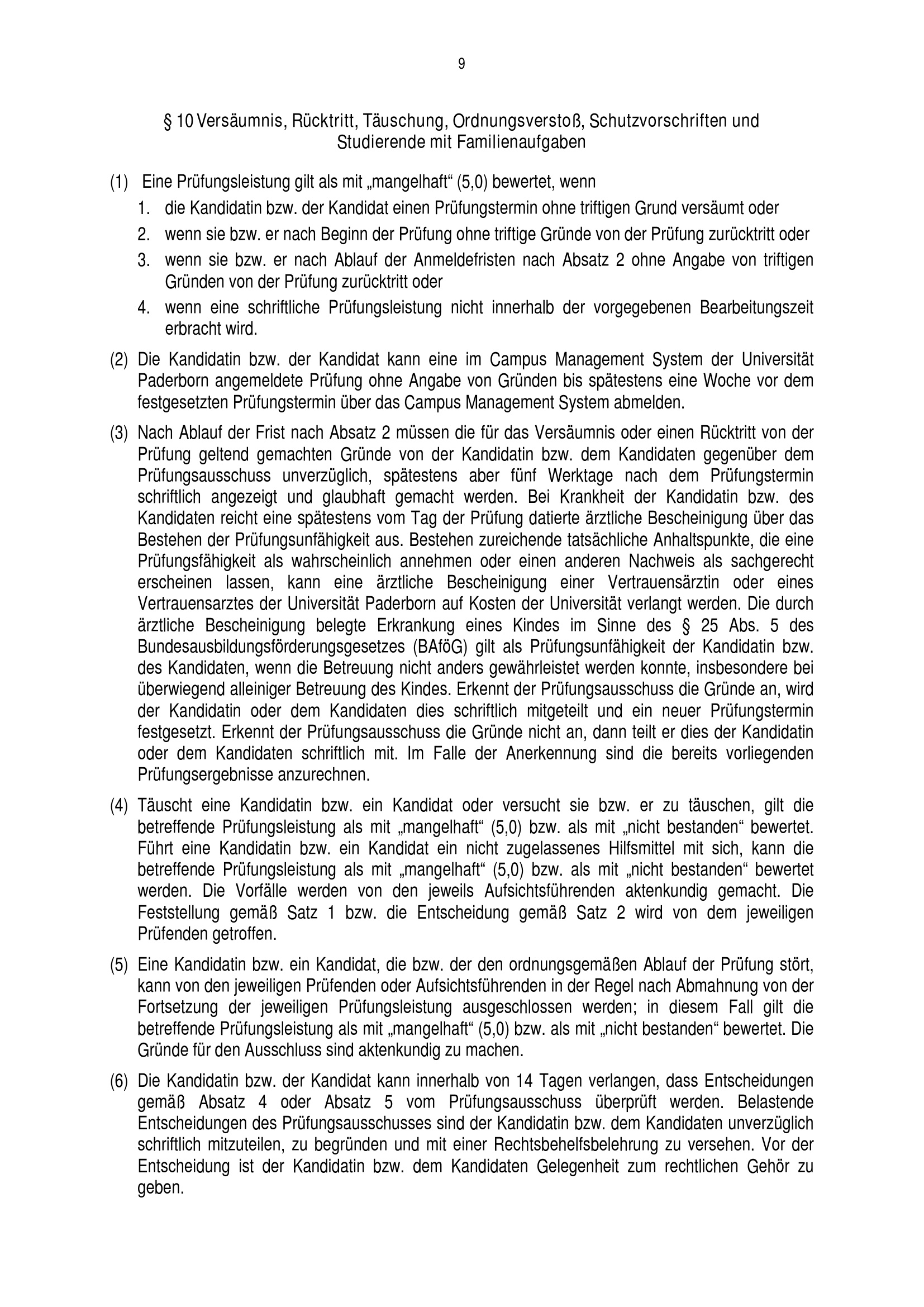 § 10 Versäumnis, Rücktritt, Täuschung, Ordnungsverstoß, Schutzvorschriften und Studierende[...]