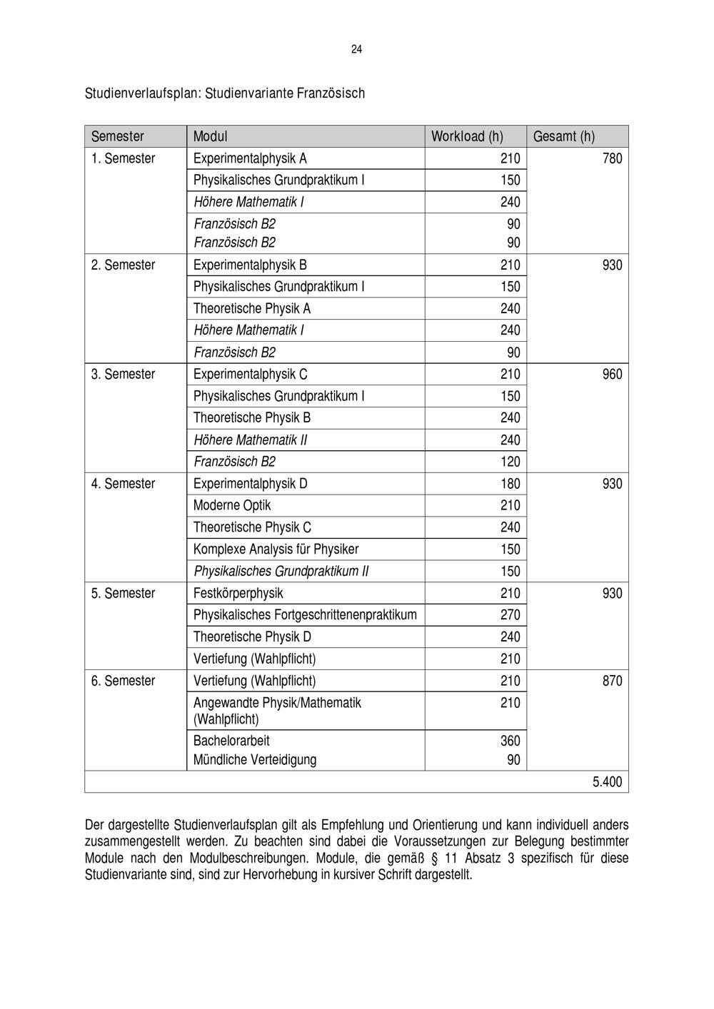 Studienverlaufsplan: Studienvariante Französisch