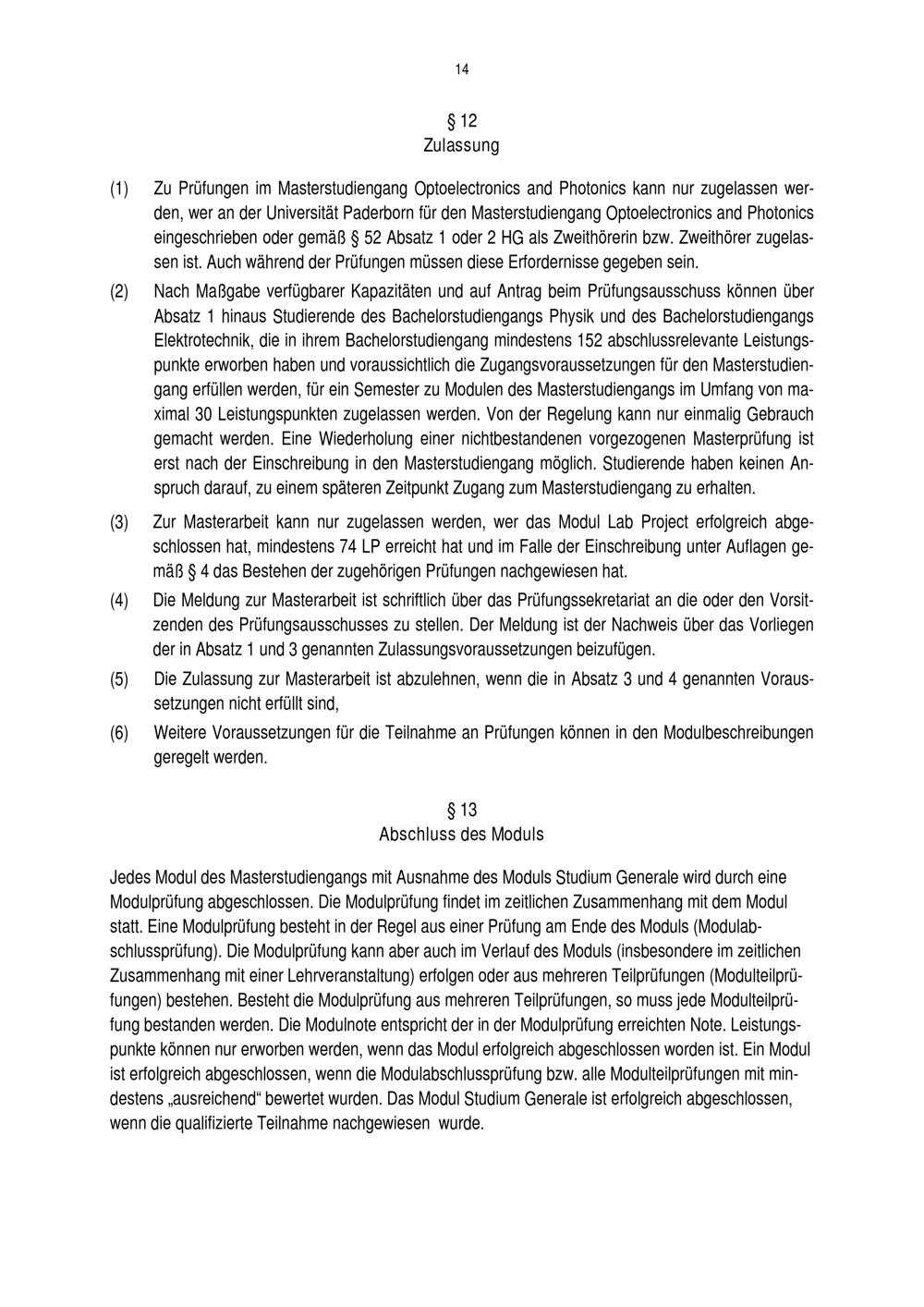 Prüfungsordnung für den Masterstudiengang Optoelectronics and Photonics der Fakultät für Naturwissenschaften an der Universität Paderborn : vom 16. Juni 2017