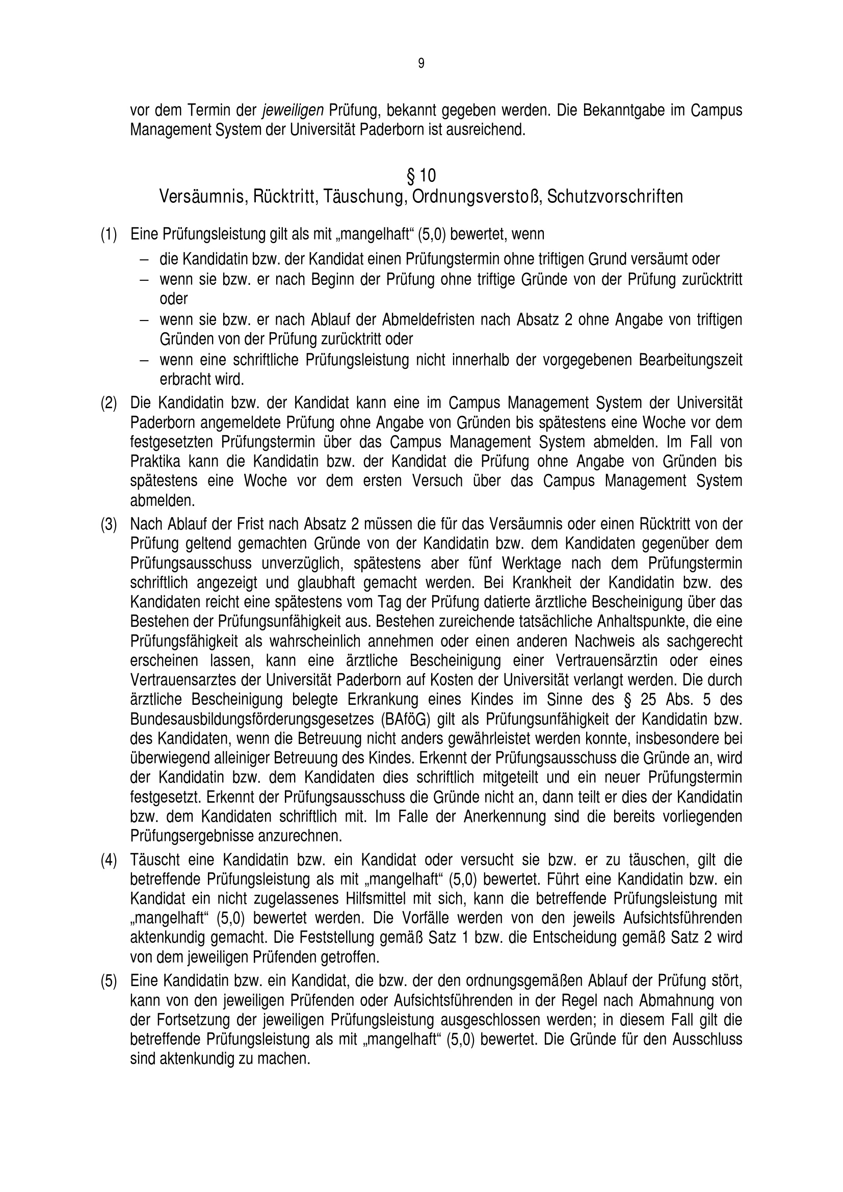 § 10 Versäumnis, Rücktritt, Täuschung, Ordnungsverstoß, Schutzvorschriften