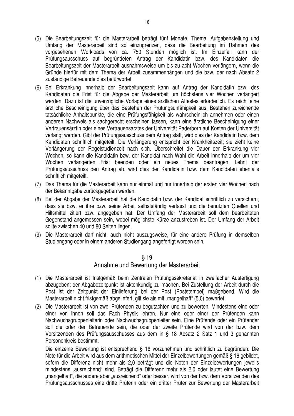 Prüfungsordnung für den Masterstudiengang Physik der Fakultät für Naturwissenschaften an der Universität Paderborn : vom 16. Juni 2017